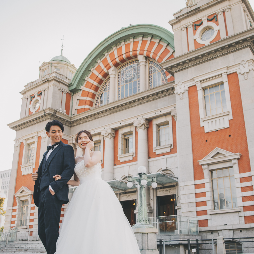 中央公会堂の側の通りで、お二人で並んで歩いている自然体のショットや、建物の前でお二人寄り添った姿がおすすめです。