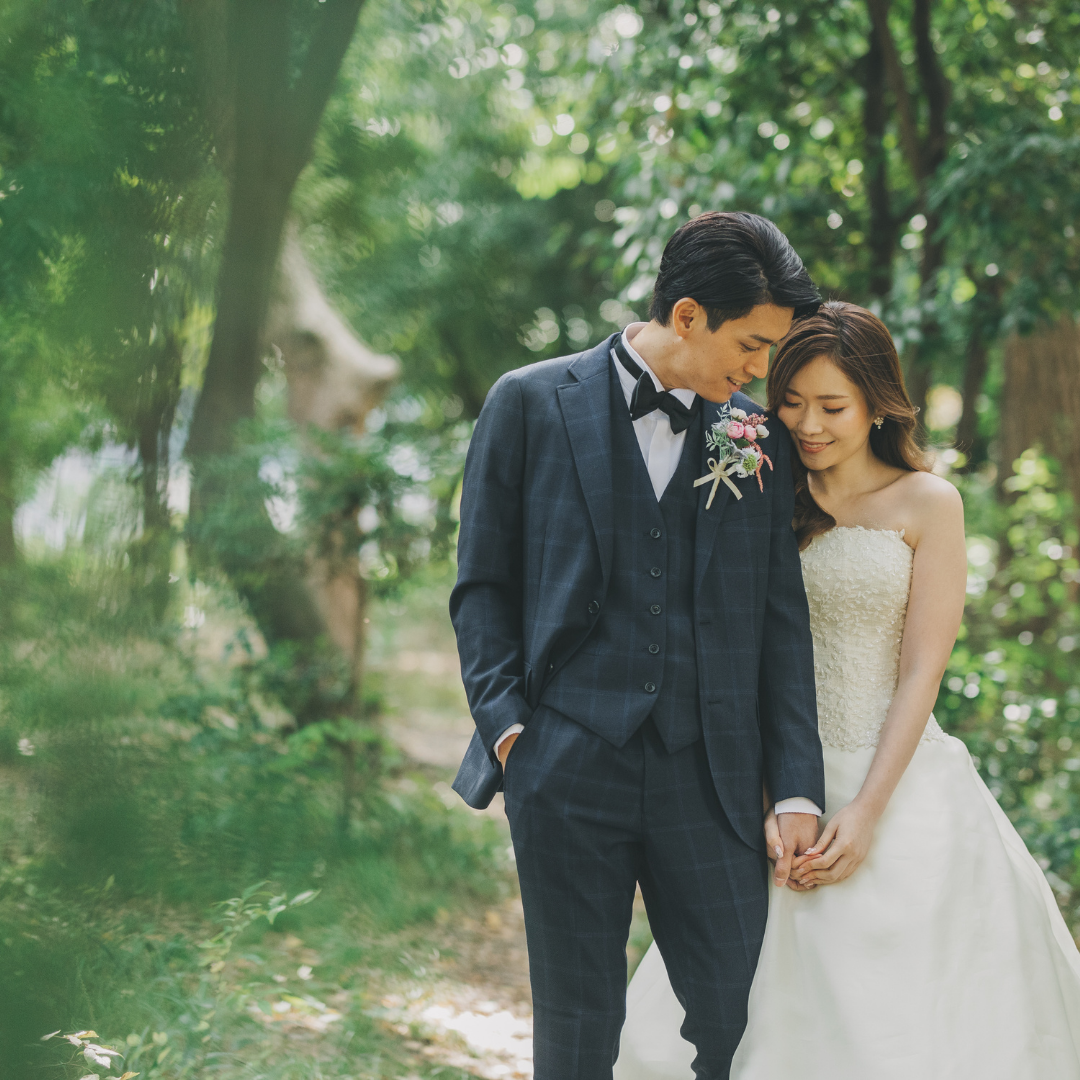新婦様はブーケを片手に、レース地のスレンダーラインやエンパイアラインが緑の中で映えます。新郎様はジャケットを脱いで、少しラフな衣装や、ブーケを持った新婦様とお揃いのお花で胸元にブートニアを挿すと想い出の1枚にすることができます。