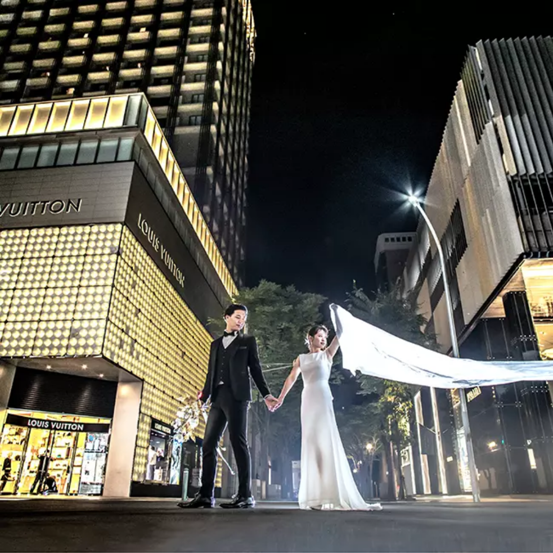 ブランドショップやオフィスビルが立ち並ぶ御堂筋は、実はフォトウェディングにおすすめの撮影スポット。11月初旬から年末にかけて通りの街路樹が一斉にイルミネーションで彩られます。