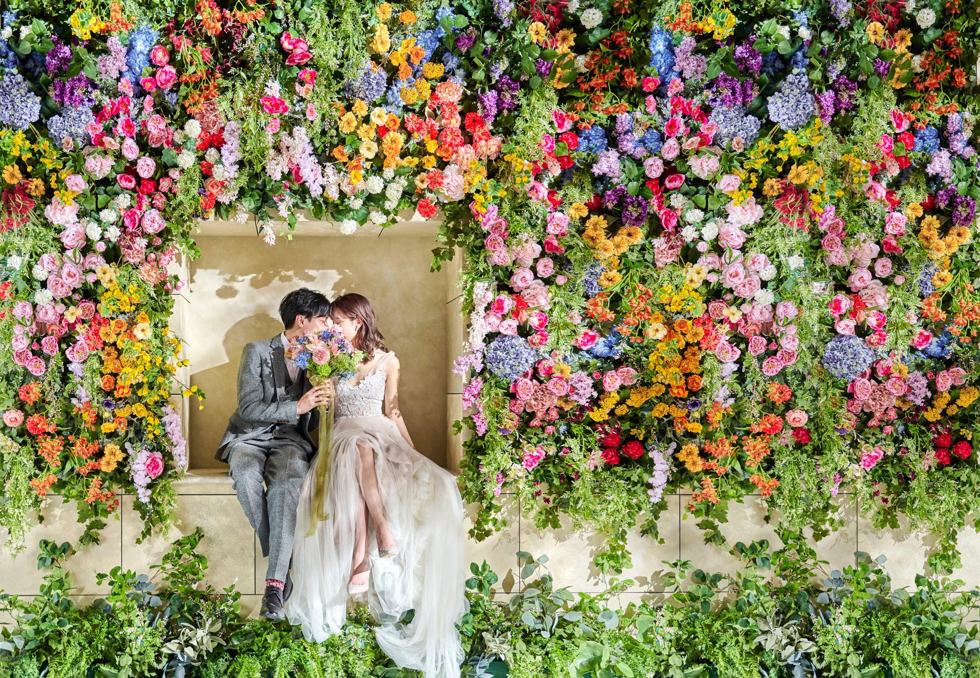 大阪のフォトウェディング専門のブランズ心斎橋では、まるで海外に来たかのようなスタジオセットがあります。フラワーウォールや韓国フォトを実現するシネマやドラマセットのような造り込んだ関西最多の30シーンのスタジオ・世界観ではウェディングフォトに没入するドラマティックな撮影体験とクオリティの高い写真を残すことができます。また大阪・京都・奈良の数々のロケーションで撮影をしてきた指名続出の人気カメラマンによる、思い出深くなるロケーション撮影も併せた、スタジオ撮影とロケーション撮影の両方をクオリティと満足度が高く実現できます。