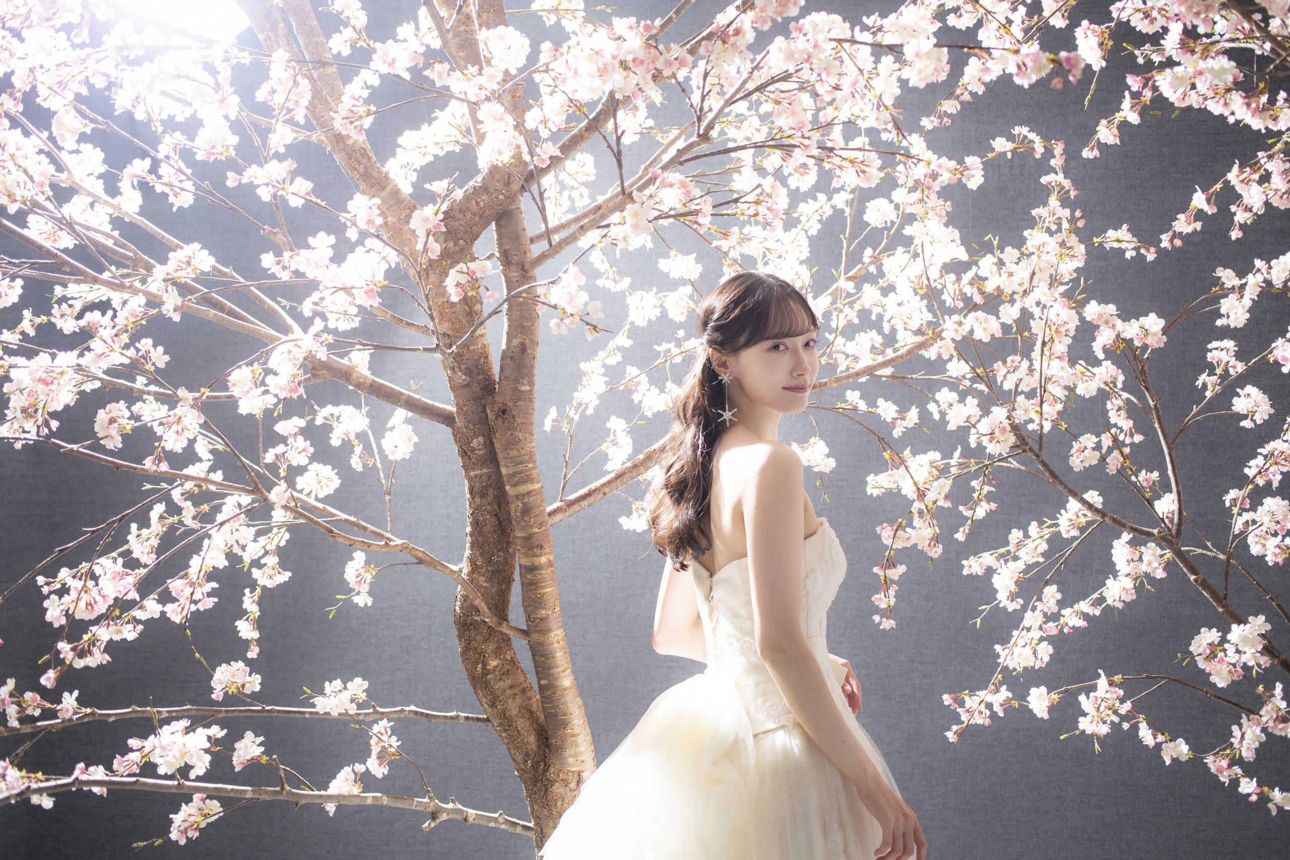 もし、桜の時期に撮影をしたくてロケーションフォト撮影を選んだのに、1日雨で理想の写真とは程遠い状態に…なんて悲しい残念な思いをさせたくない!とブランズ心斎橋にはスタジオに5メートルを超える桜のセットがあり、大輪の満開の桜の前で撮影も可能です。