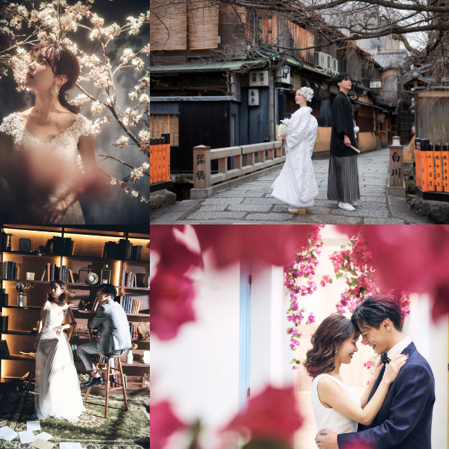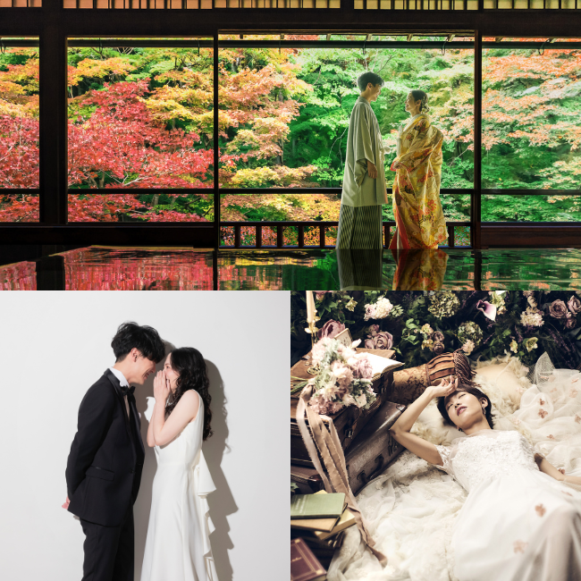 撮影場所は、写真の印象を大きく左右します。自然光が降りそそぐ屋外や、歴史的な建築物のある場所、おふたりにとっての思い出の場所など、様々なロケーションから選ぶことができます。事前に下見を行い、撮影許可が必要な場所では許可を取るなどの手続きも忘れずに。また季節や時間、天候を気にせず、ふたりの撮影したい日時で撮影もできるスタジオ撮影。さまざまなスタジオがある中でも屋外で撮影したような照明ライティングが設計され、写真映えする装飾も映画やドラマセットのように「実際に現地にいる」かのような凝って造り込まれたスタジオが各地で登場しています。