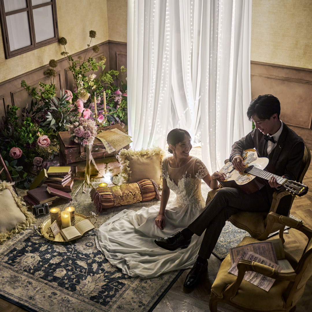 ライトを使った演出は、フォトウェディングに幻想的な雰囲気をもたらします。特に、夕暮れ時や夜間、暗めのスタジオの撮影ではフェアリーライトやキャンドル、ランタンなどの照明アイテムがよりロマンティックな雰囲気を演出してくれます。