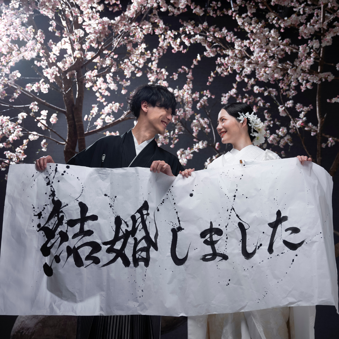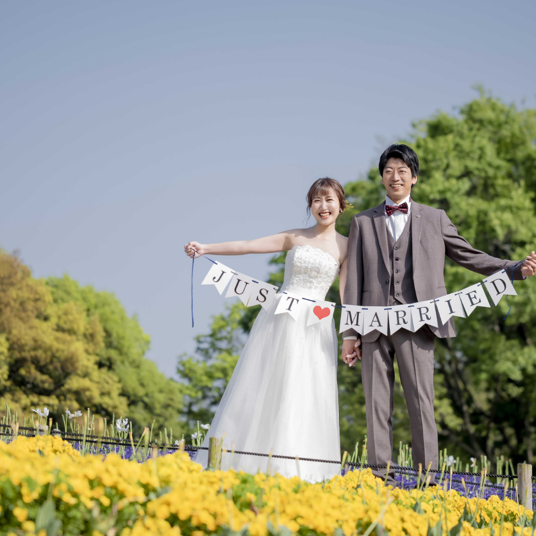 結婚報告アイテムを使ったフォトウェディングは、特別な瞬間を家族や友人に伝えるのに最適です。例えば、「We’re Married」や「Just Married」のサインボードを持った写真は、結婚報告のカードやSNSでのシェアにぴったりです。