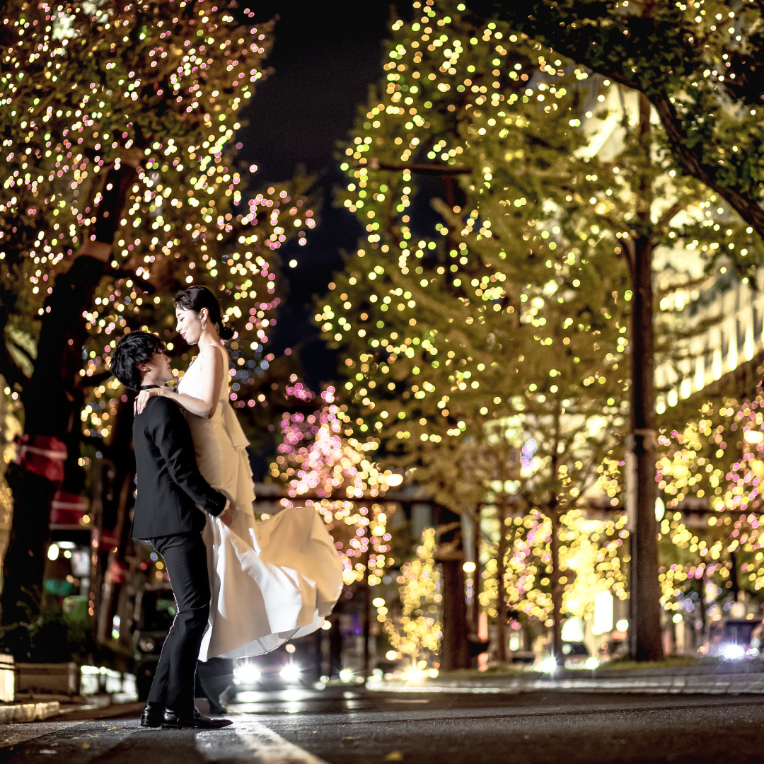 また、街の灯りや建物のライトアップを活かし、自然なライティングを取り入れた撮影がナイトロケーションならではの雰囲気を作り出して、よりロマンティックな写真になるのでおすすめです。