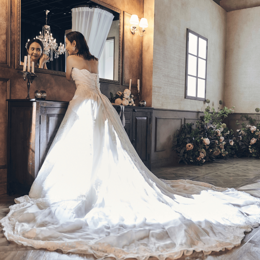 ドレスはソロウェディングのメインとなるアイテム。気に入ったドレスを選ぶことはもちろん、スタジオの雰囲気や撮影イメージに合ったデザインを選ぶことも大切です。ブランズ心斎橋では、豊富なドレスラインナップの中から追加料金なしでお好みの一着を見つけることができ、理想のドレス姿での撮影が叶います。
