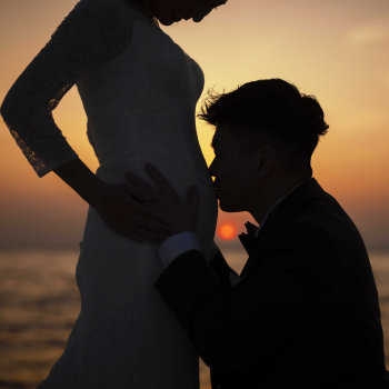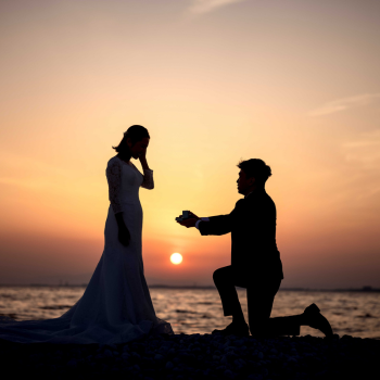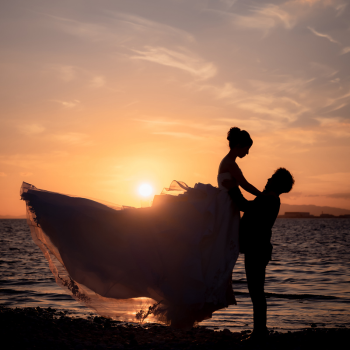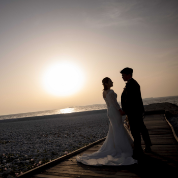 日が沈みはじめる時間帯は、空と海がオレンジ色に染まりおふたりをやさしく照らします。