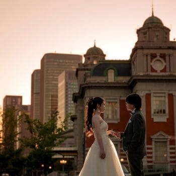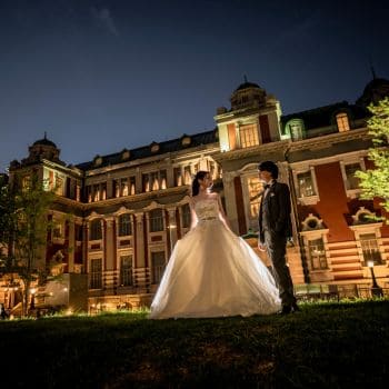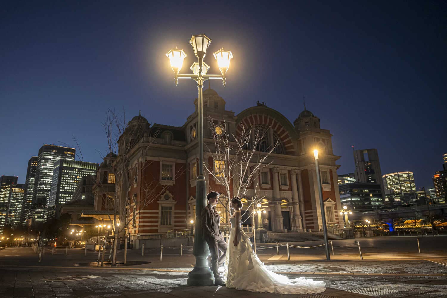 日没後には、建物が温かな光に包まれ、昼間とはまた違ったロマンチックな雰囲気に。夜景とともに撮る一枚は、まさにフォトウェディングならではの特別な体験です。しっとりとした大人の雰囲気を残したいおふたりにおすすめです。