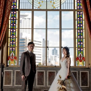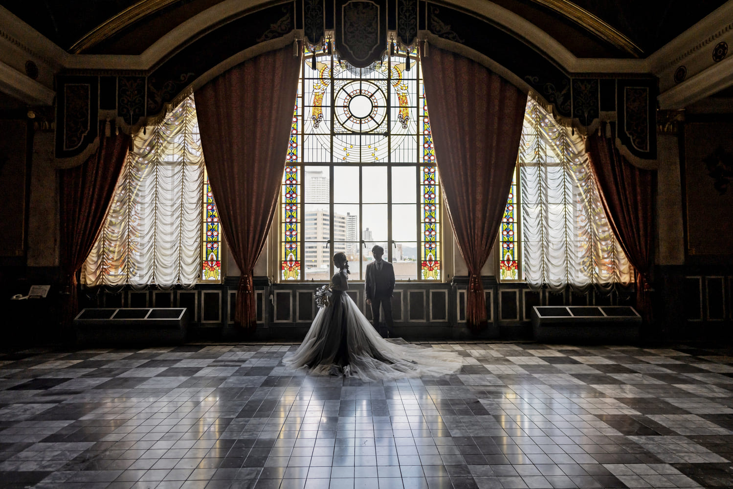 高い天井とステンドグラスが印象的な特別室は、クラシックで落ち着いた雰囲気。重厚感のある装飾が花嫁姿を引き立て、まるで絵画の中に入り込んだような写真が残せます。非日常を感じる空間で、特別なウェディングフォトを残しませんか。