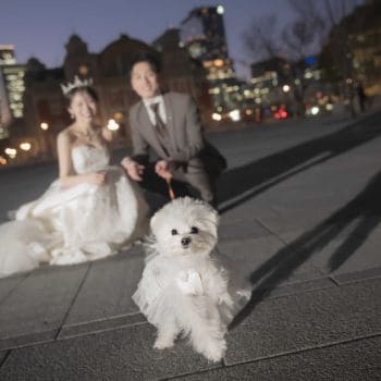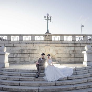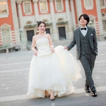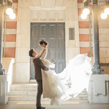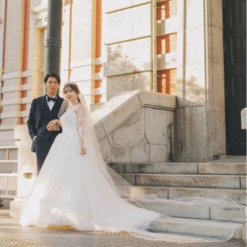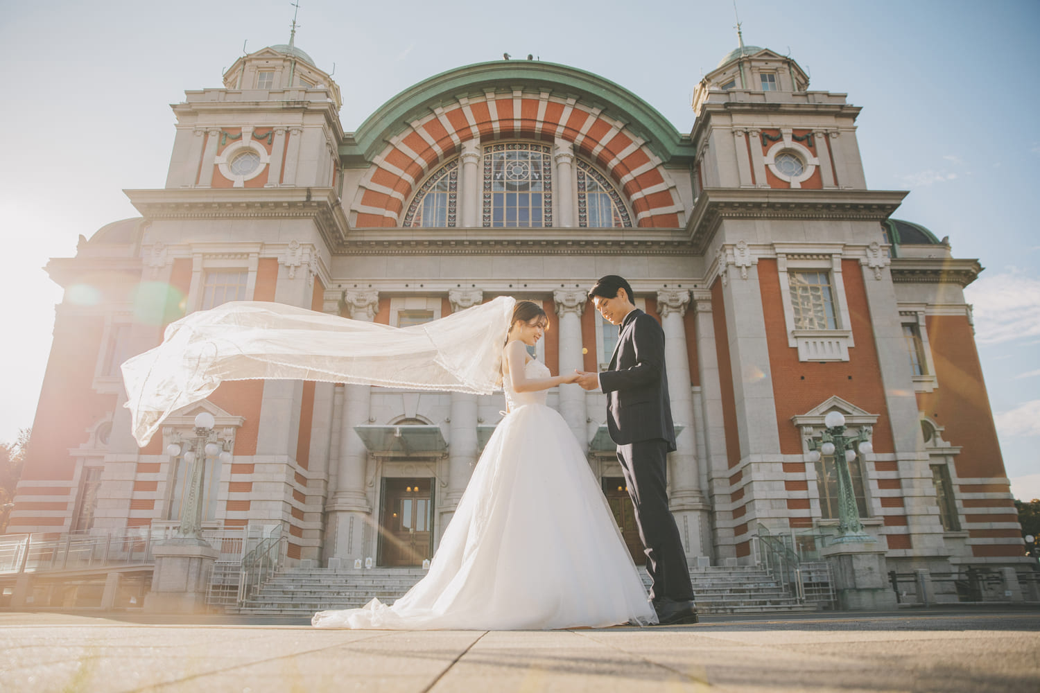 大正時代の洋風建築が美しい大阪市中央公会堂。赤レンガと青銅のドームのコントラストが印象的で、まるで映画のワンシーンのようなドラマチックな1枚が叶います。ウェディングドレスの純白が映えるロケーションとして、花嫁様からも人気の高いスポットです。