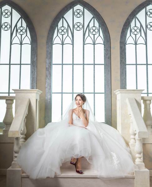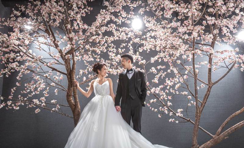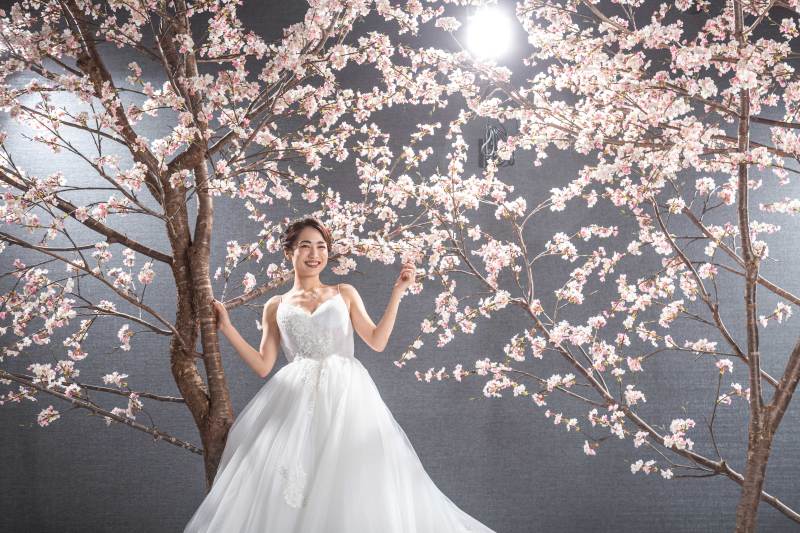 ご好評頂いている大きな三連窓やスタジオ内にある巨大な桜のオブジェ、フラワーウォールで撮影いただきました。
