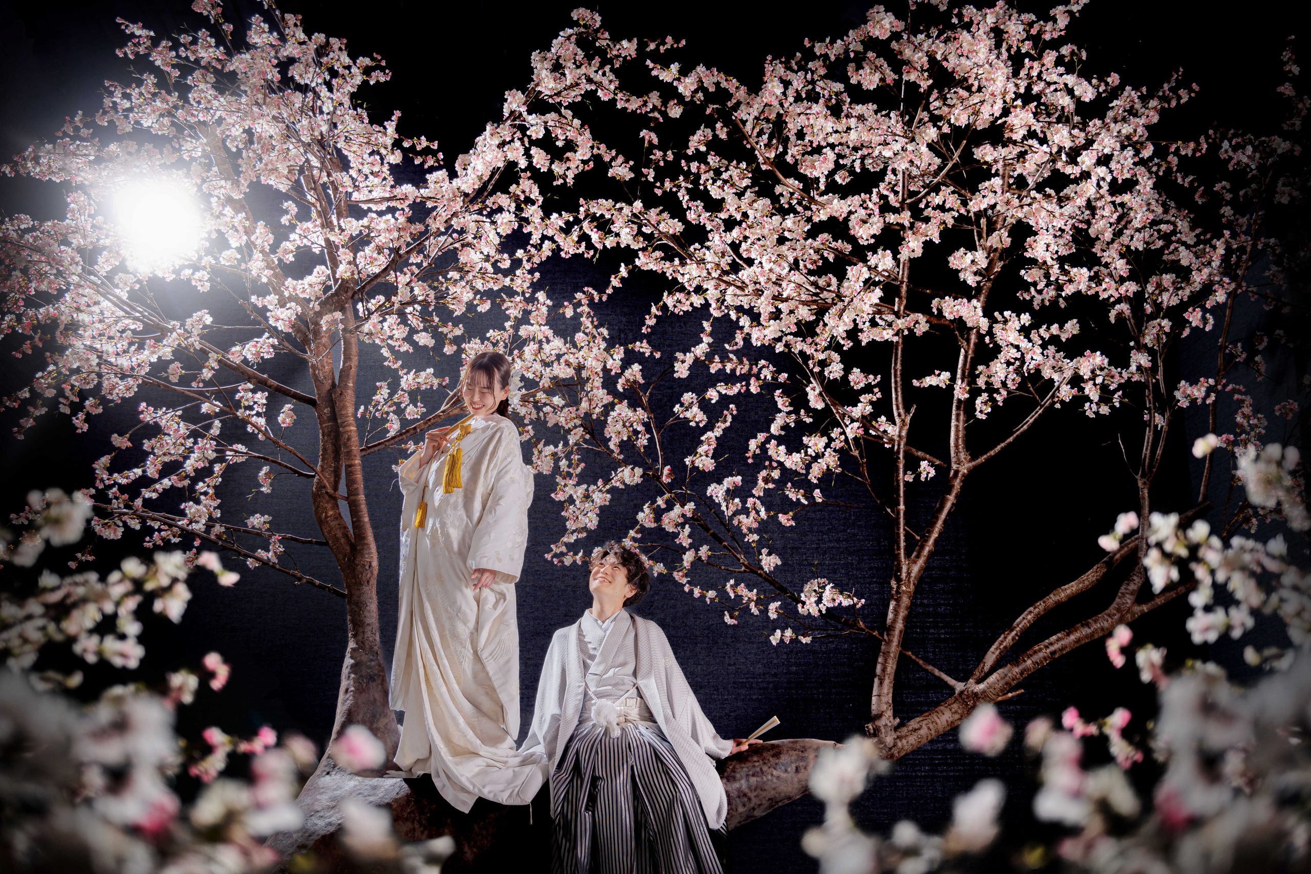 清楚な白無垢姿のご新婦様の立ち姿が美しい「桜」のシーンから撮影スタート!