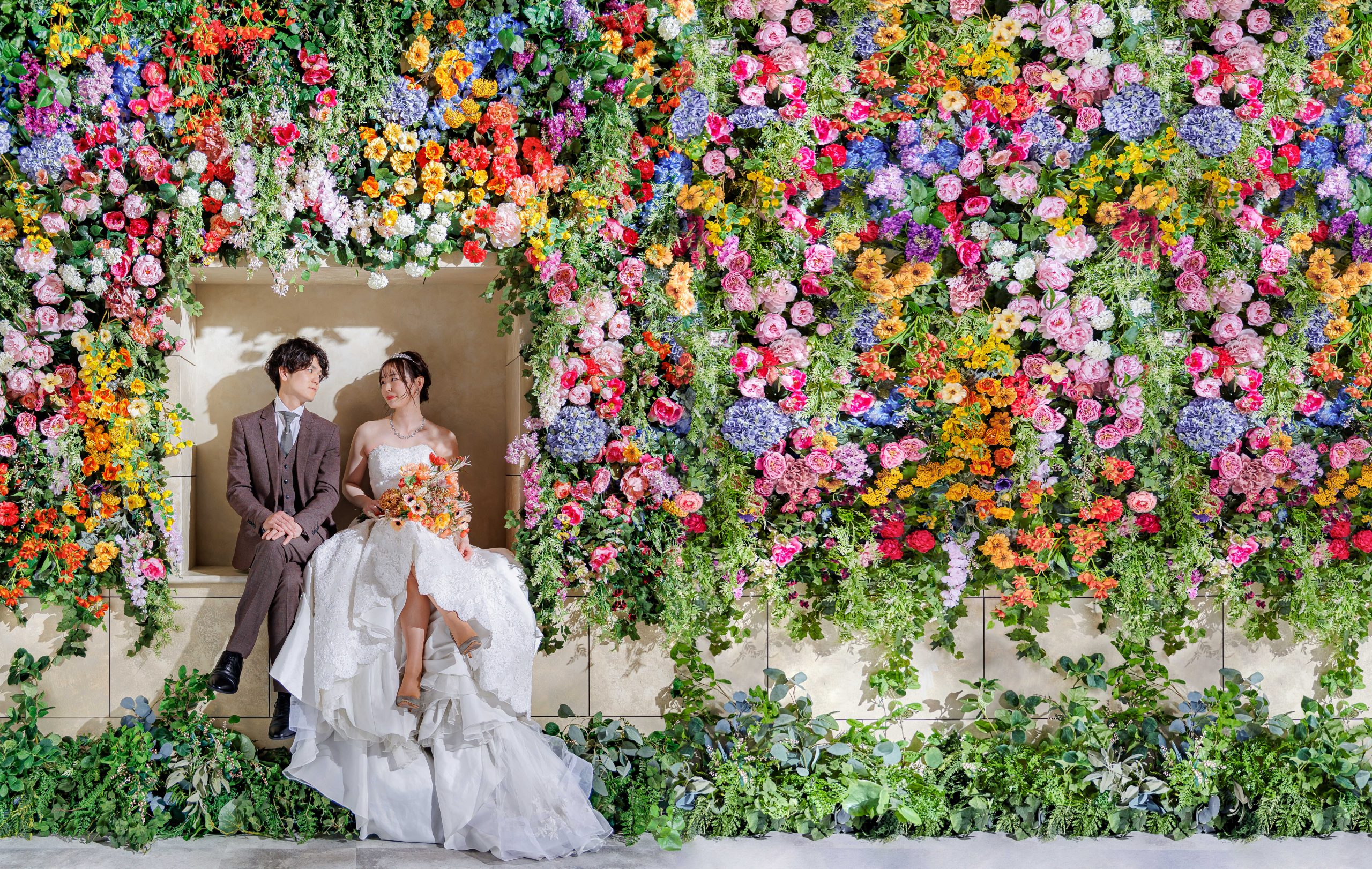 ご新婦様人気ナンバーワン「フラワーウォール」で足組みショット!