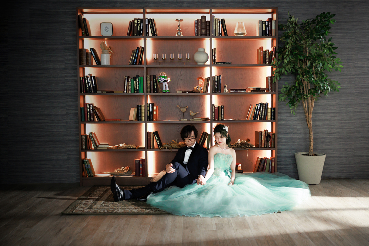 こちらのブックシェルフのスタジオシーンではおふたりの大切なアイテムをそっと本棚に忍ばせてお撮りいただけるんです♪