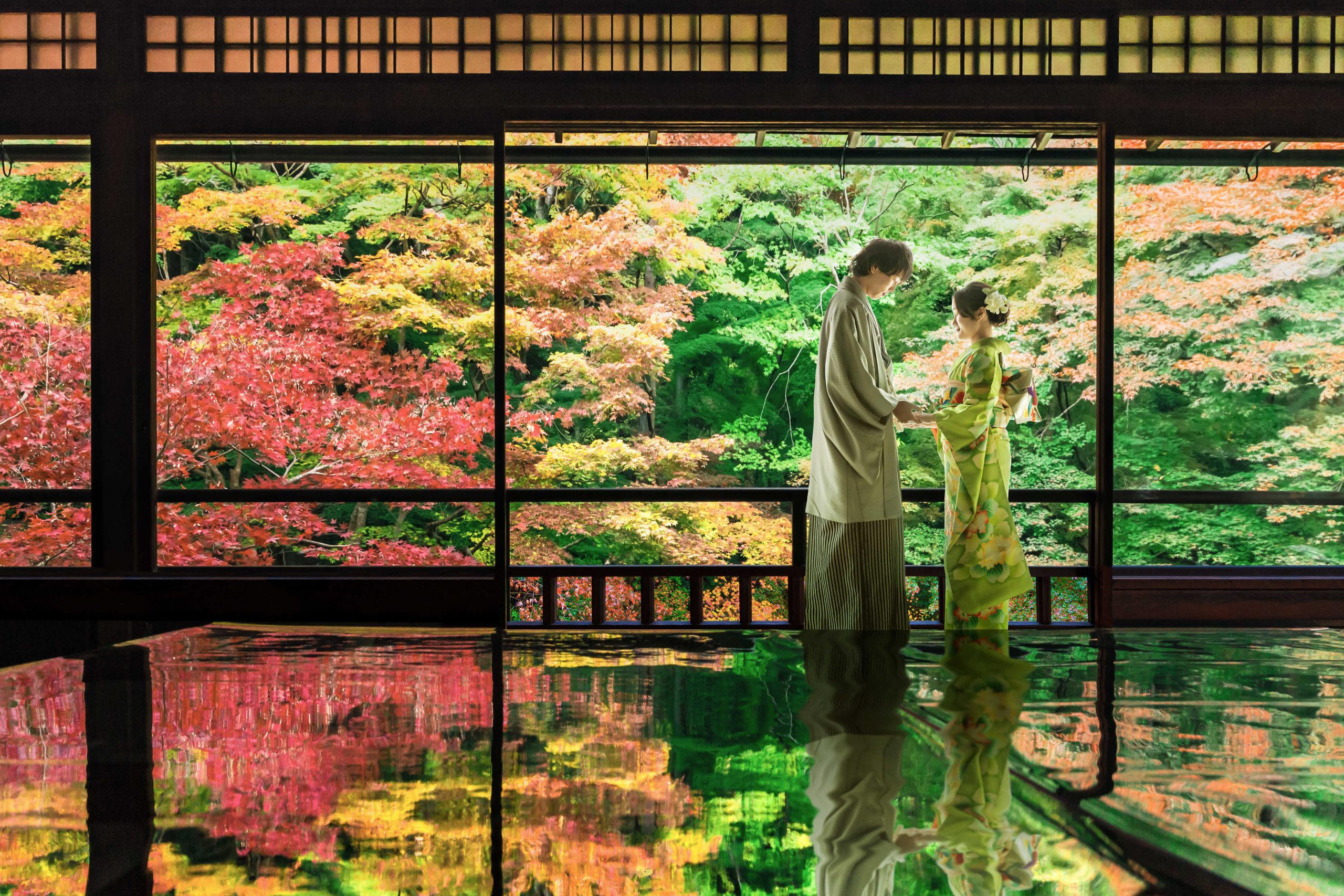 瑠璃光院の静寂な空間で、手を取り合うおふたりが厳かに映え、伝統美を堪能できる優美なショット。