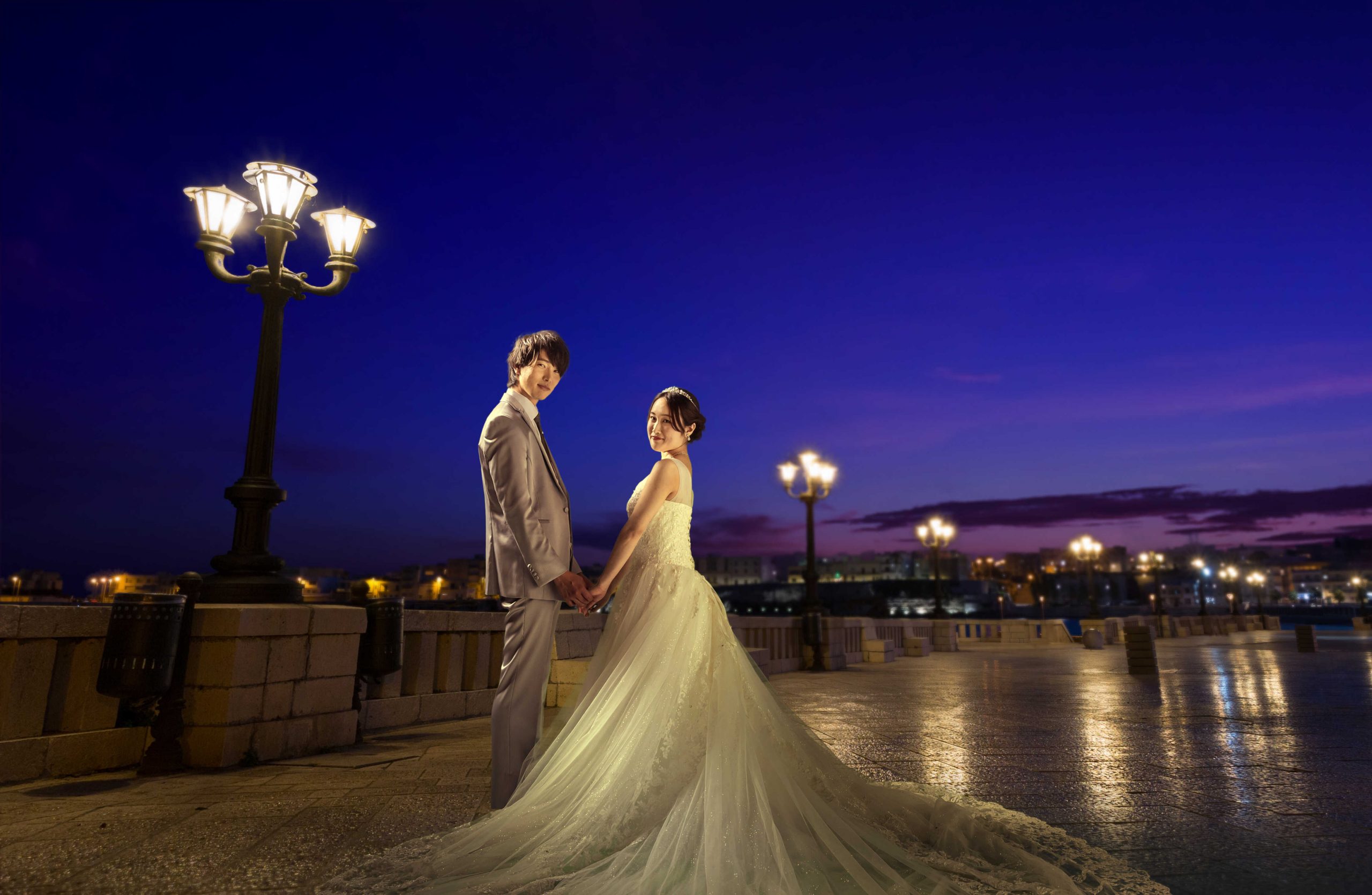 夜空の下、ナイトブリッジでウェディングドレスが輝く特別な瞬間を捉えました。