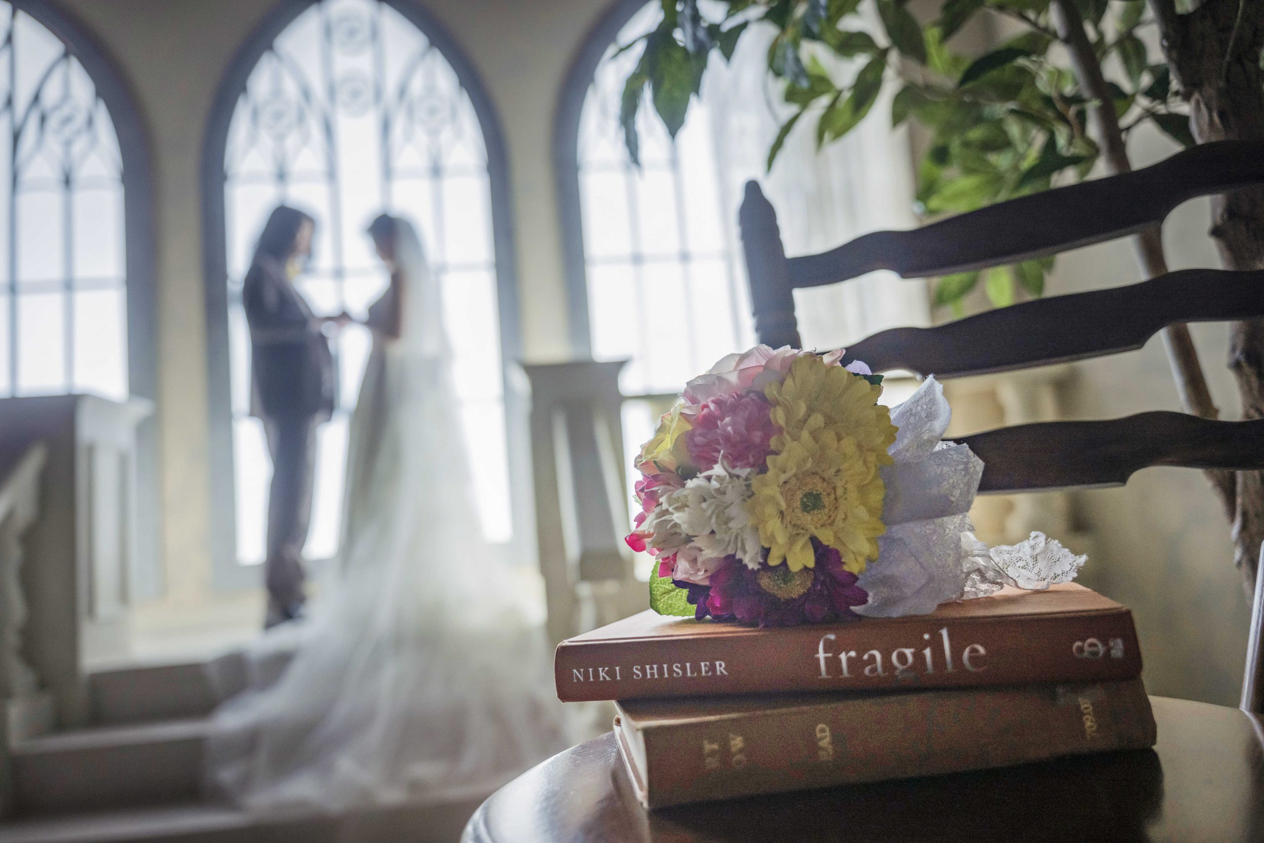 チャペルで愛を誓い合うおふたりと大切なブーケをシューティング。