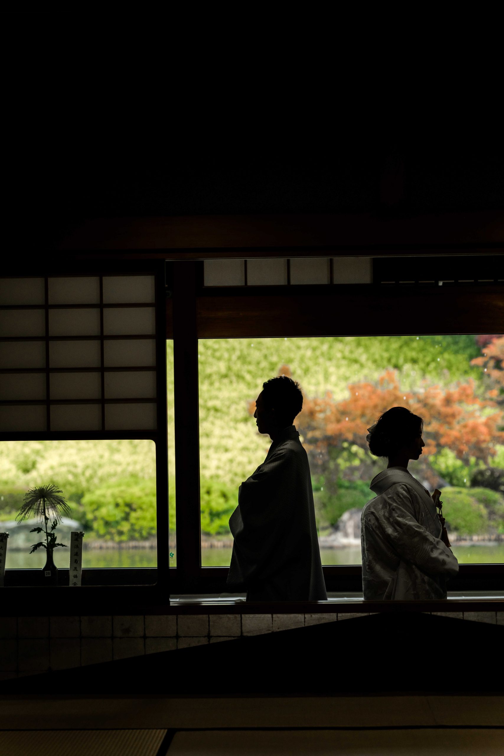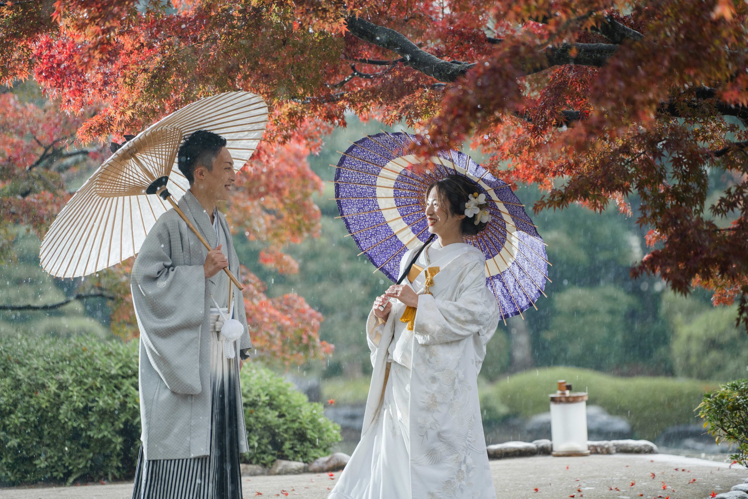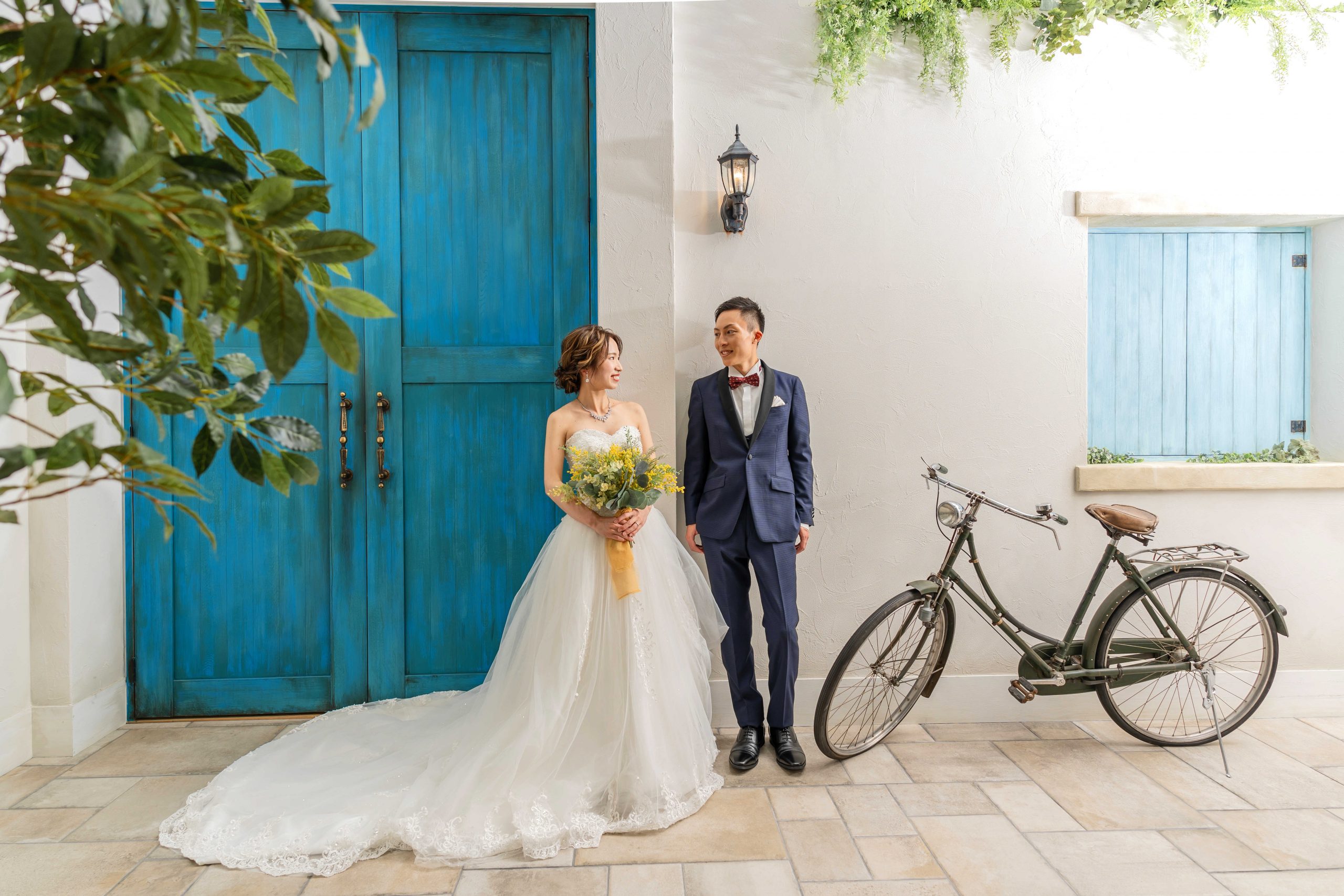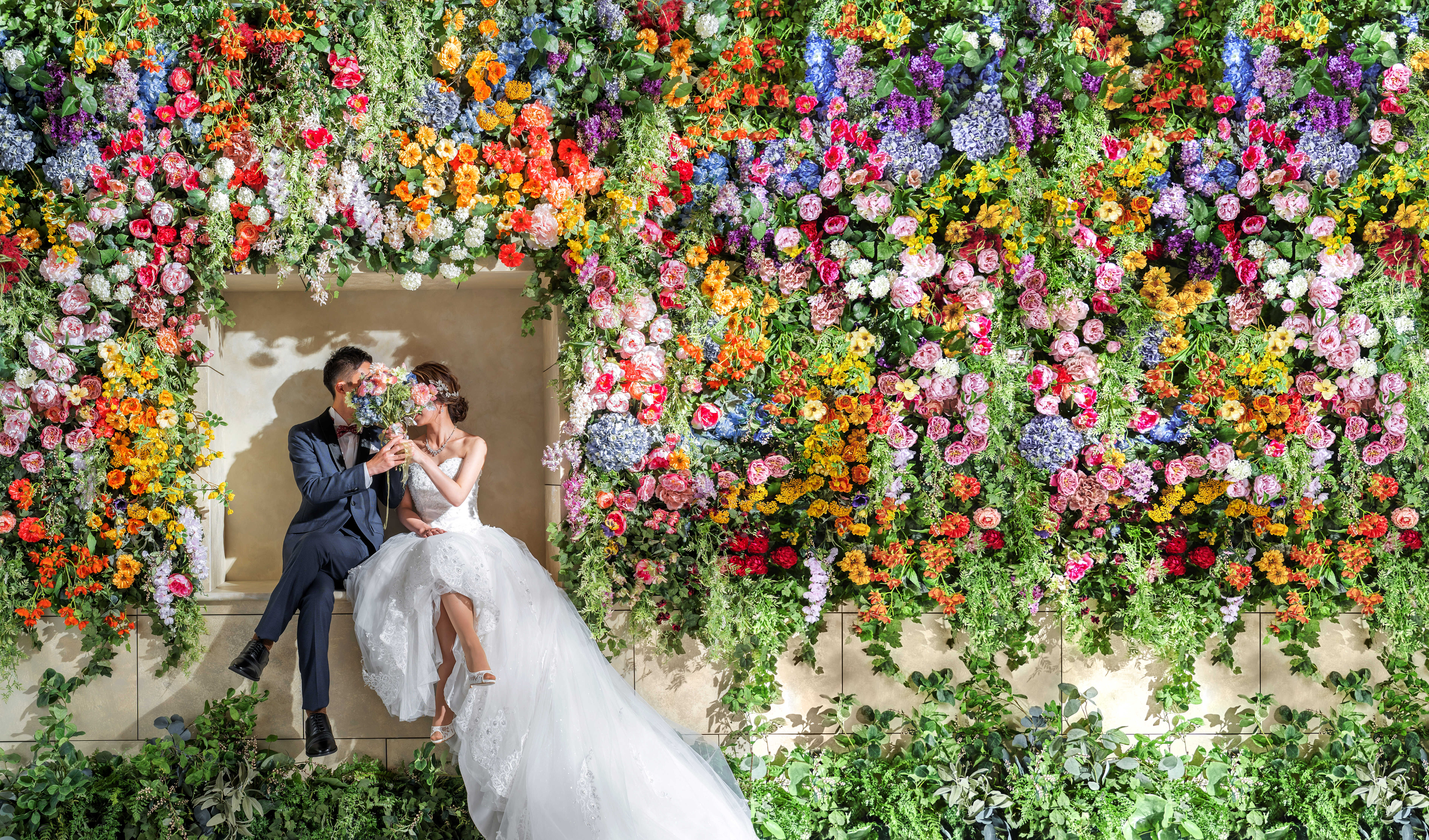 おふたりが身体を寄せ合って、手に持ったブーケでお顔を隠しています。