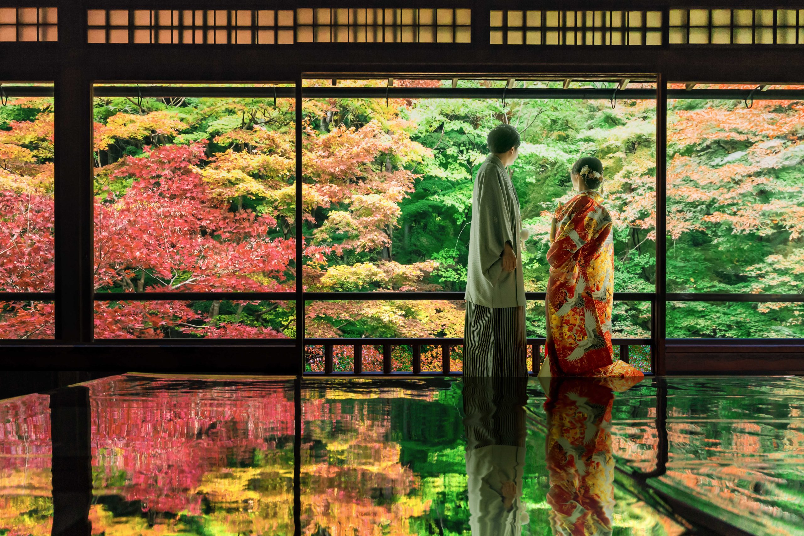 日本の美が詰まった瑠璃光院で、色打掛の華やかさが一層引き立つ瞬間。