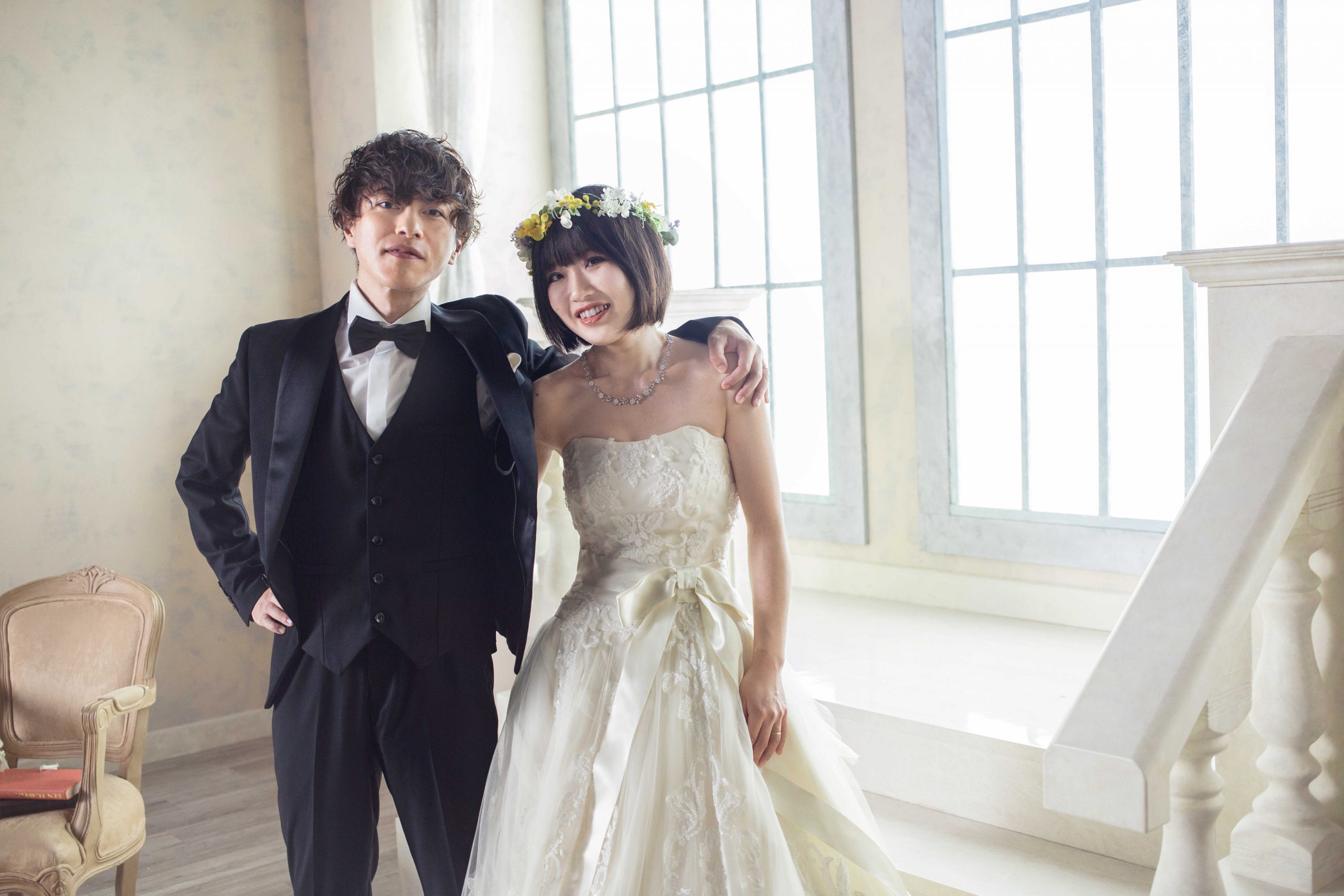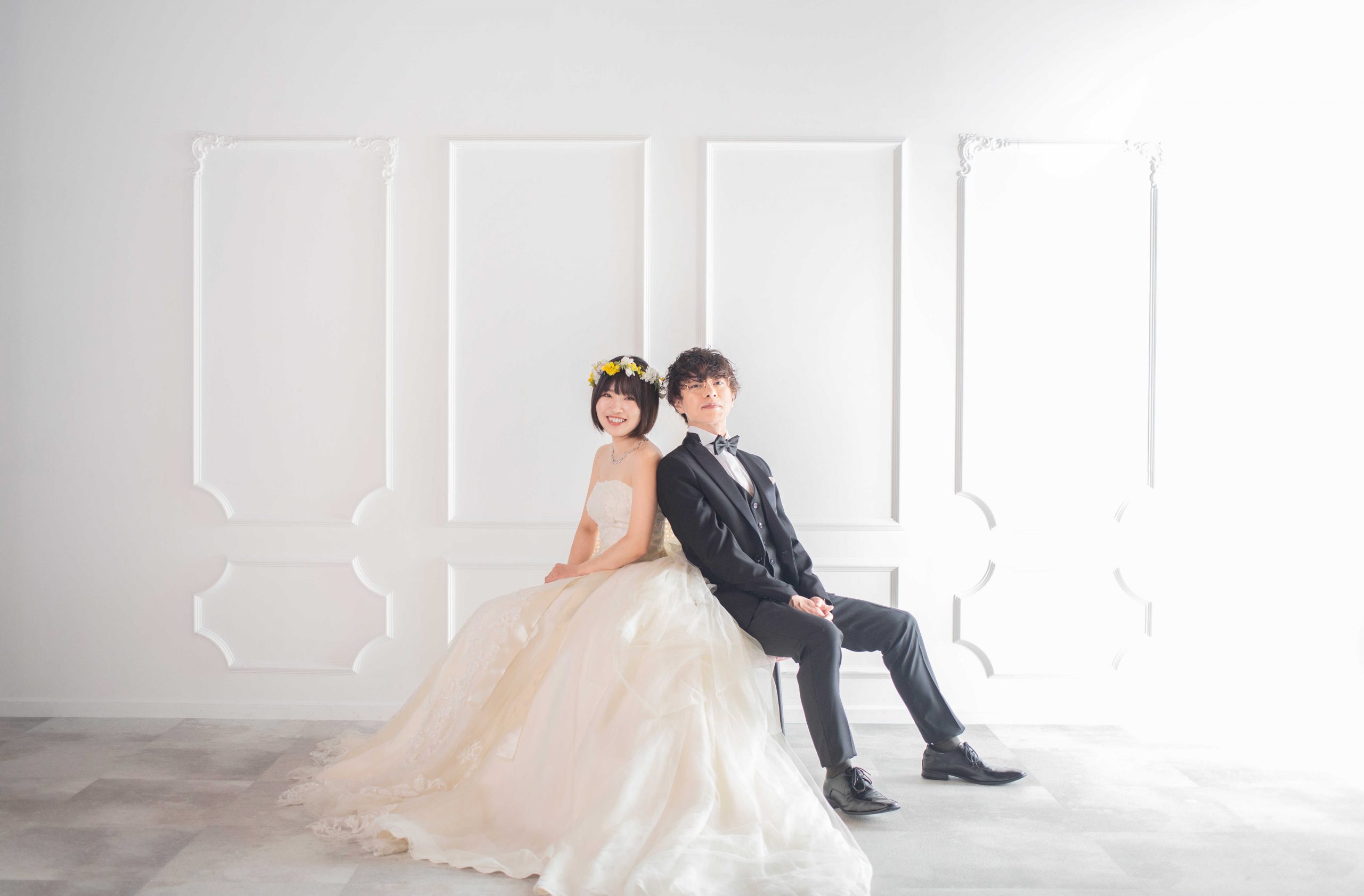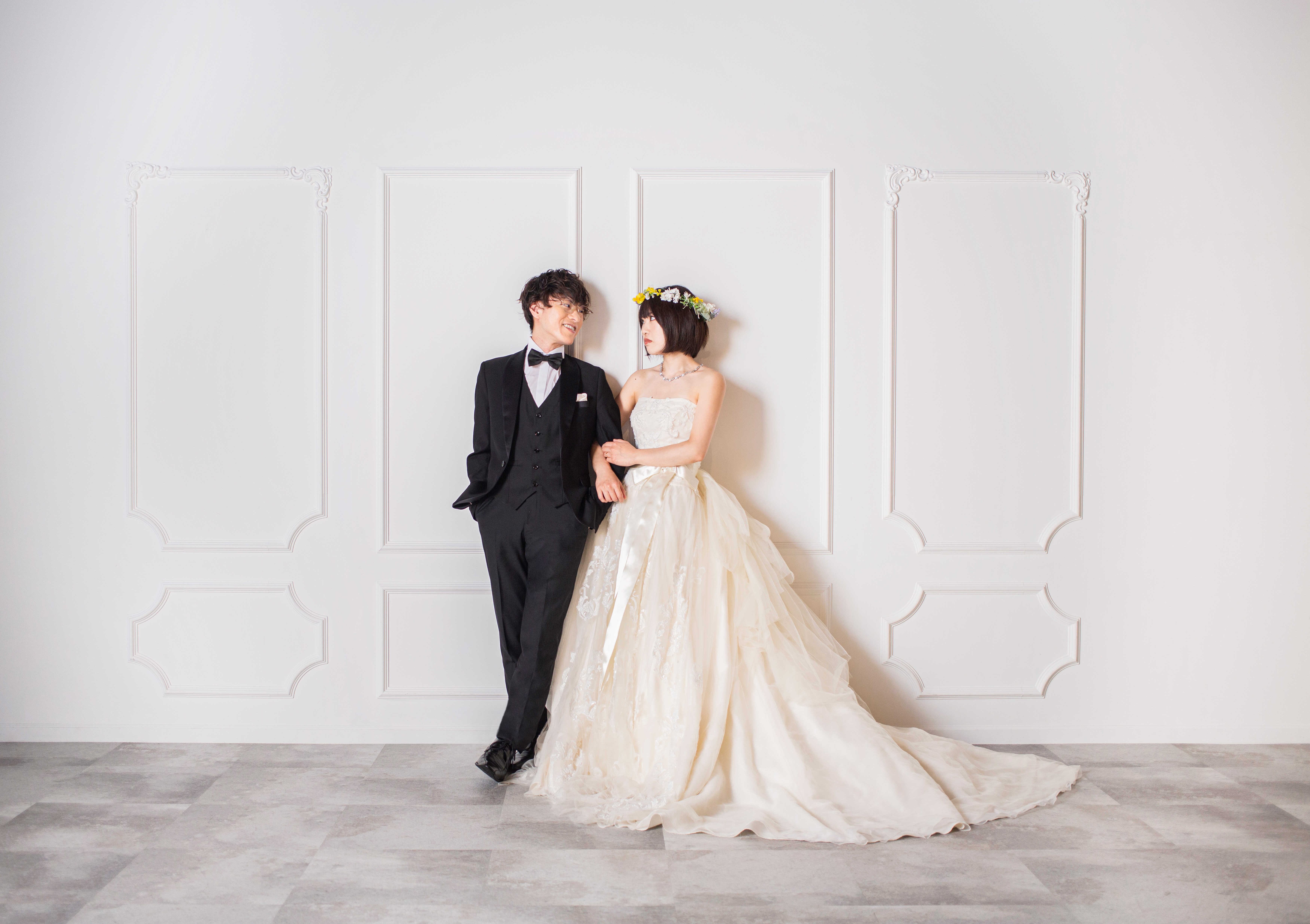 シンプルなホワイトウォールで体を寄せ合うおふたり♡