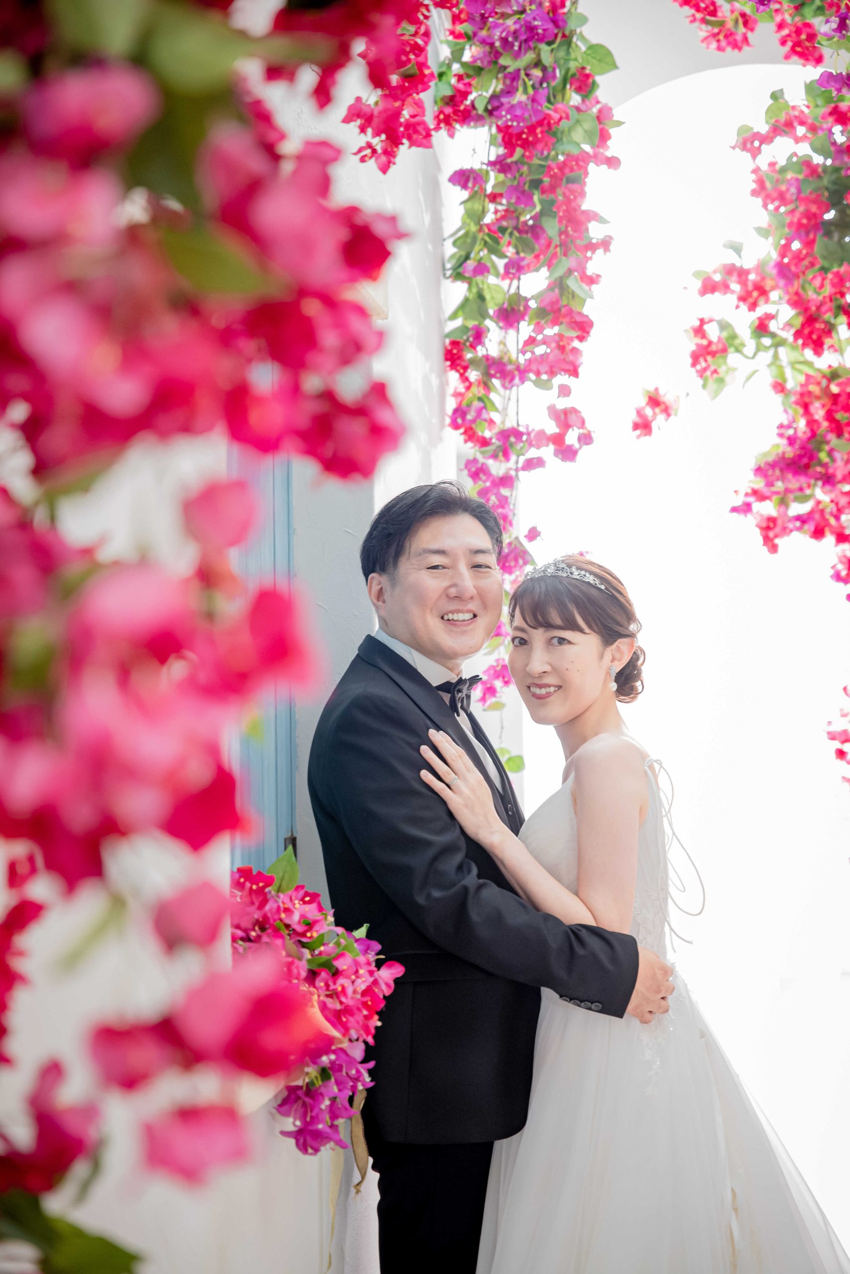 鮮やかなブーゲンビリアに包まれた中、二人がそっと抱き合う瞬間を捉えました。