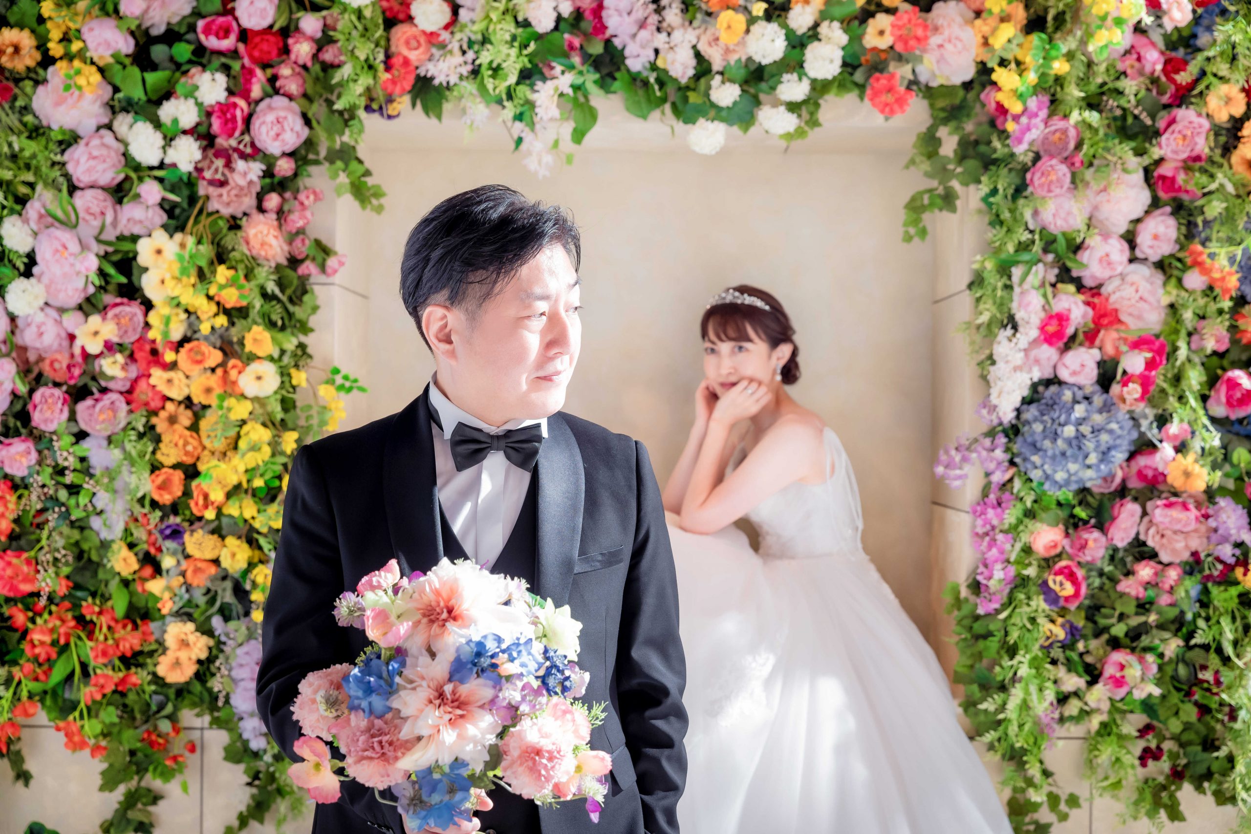 ブーケを持つ新郎様が、新婦様を背にしてドキドキ。