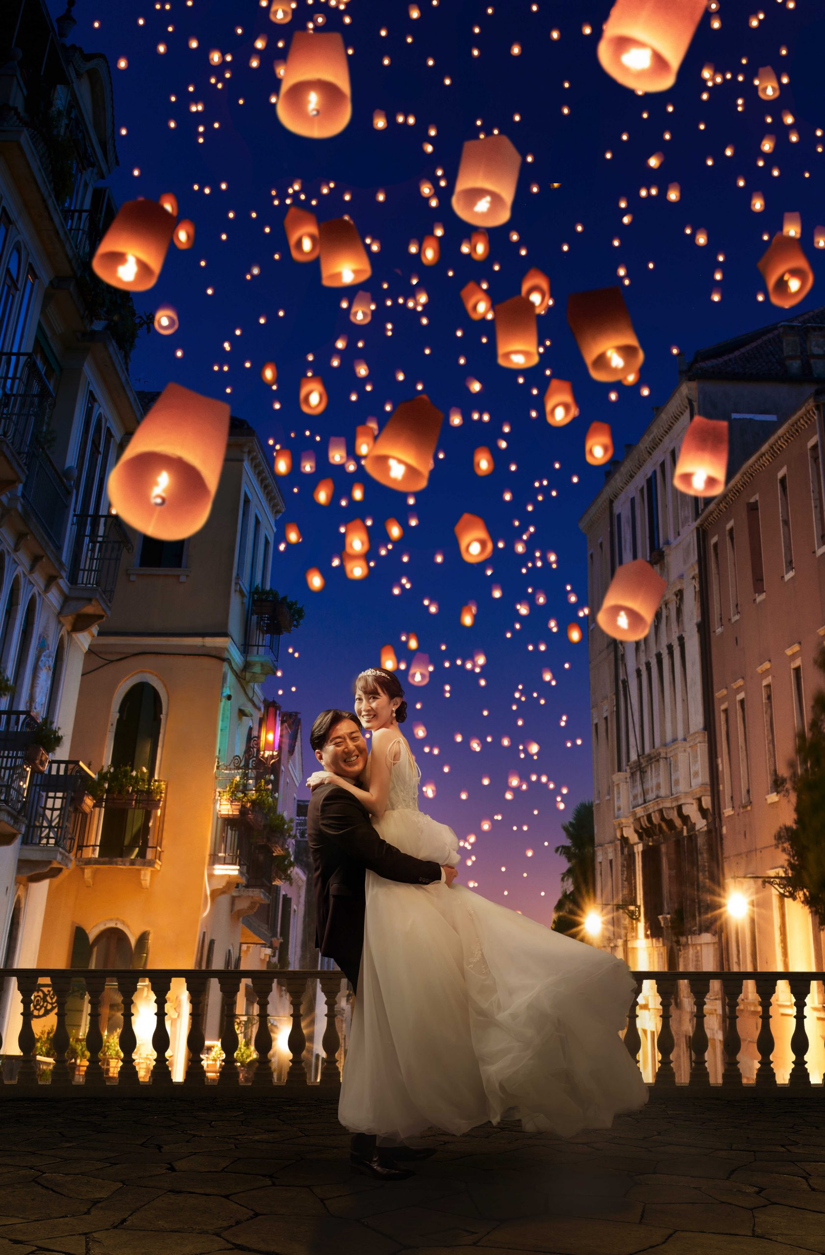 ランタンが輝く夜の街で、新郎様に抱き上げられる新婦様。