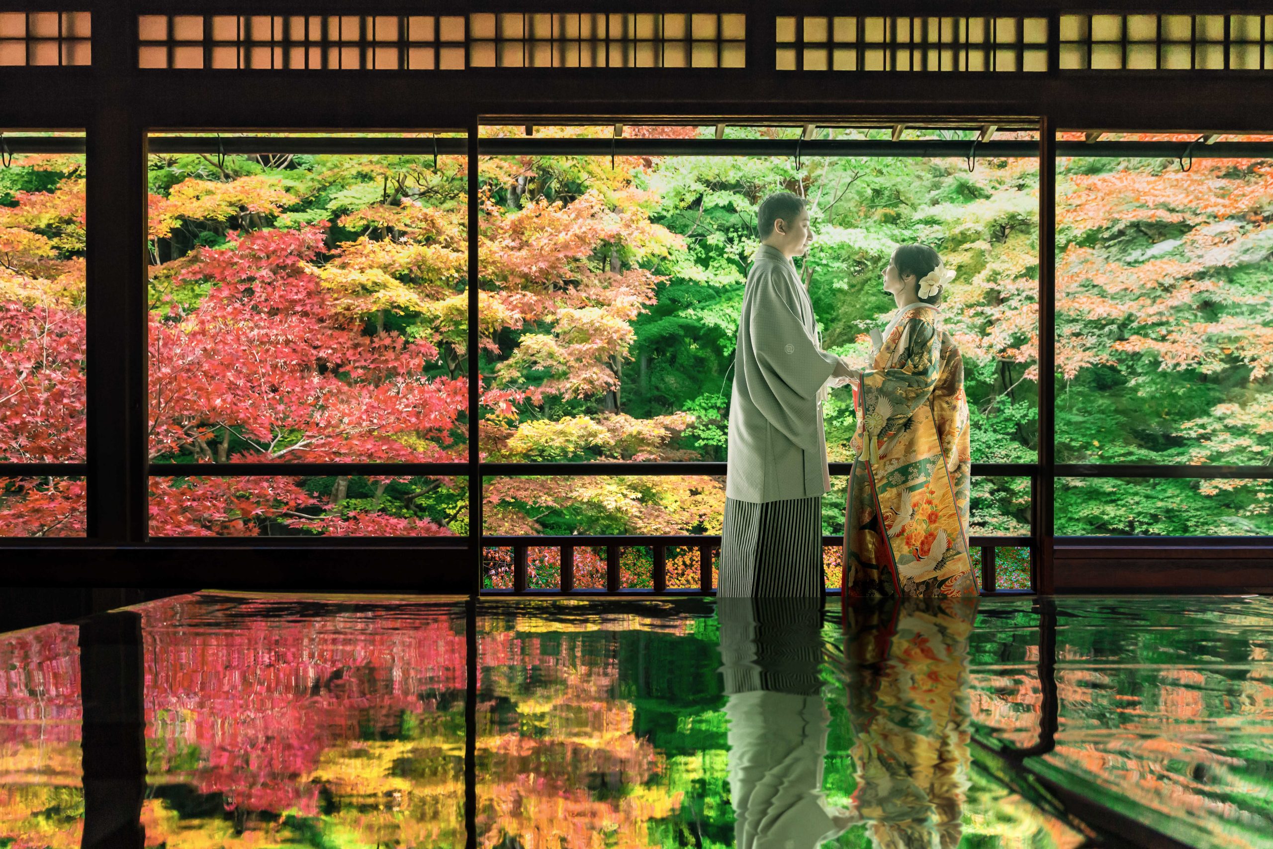 京都の名所・瑠璃光院の紅葉で見つめ合うおふたり。