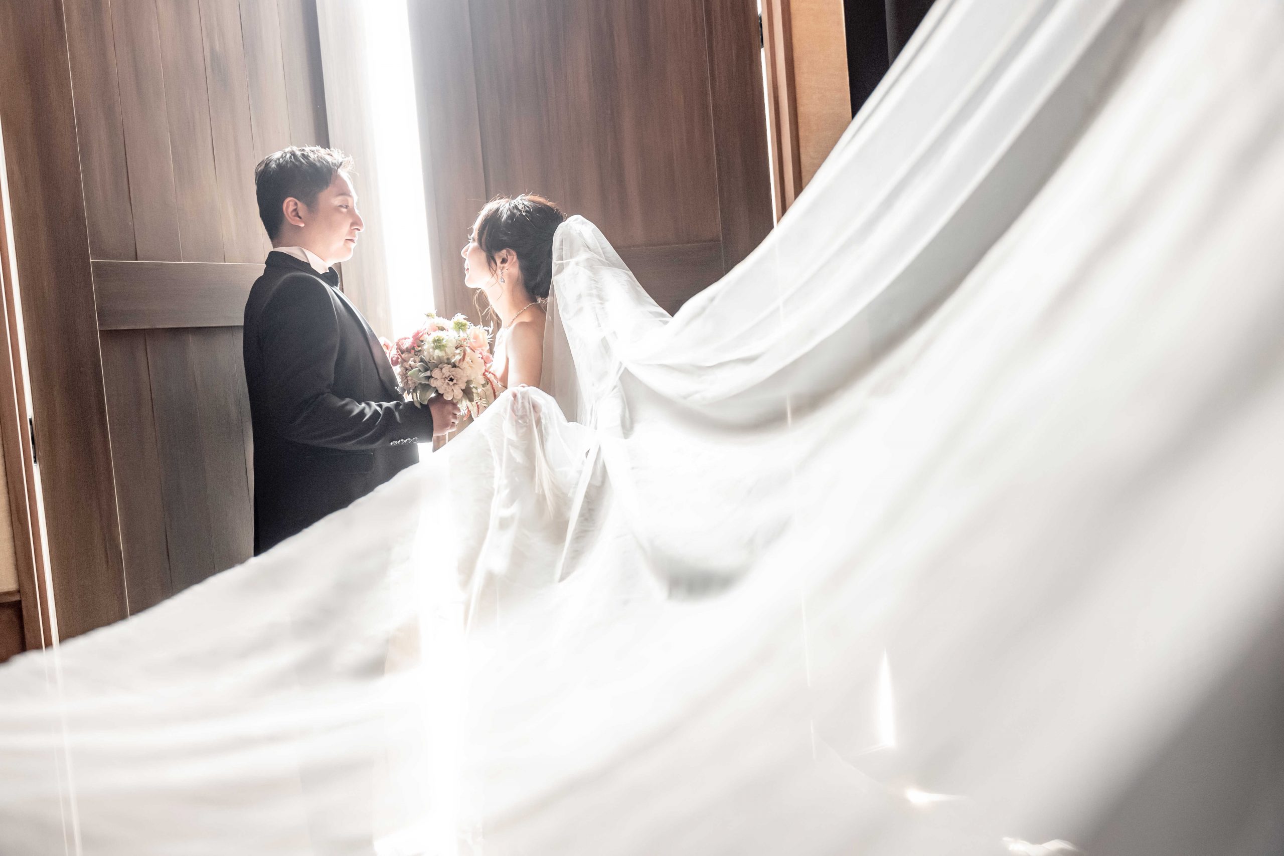 舞い上がるベールの動きが瞬間の美しさを引き立てています。