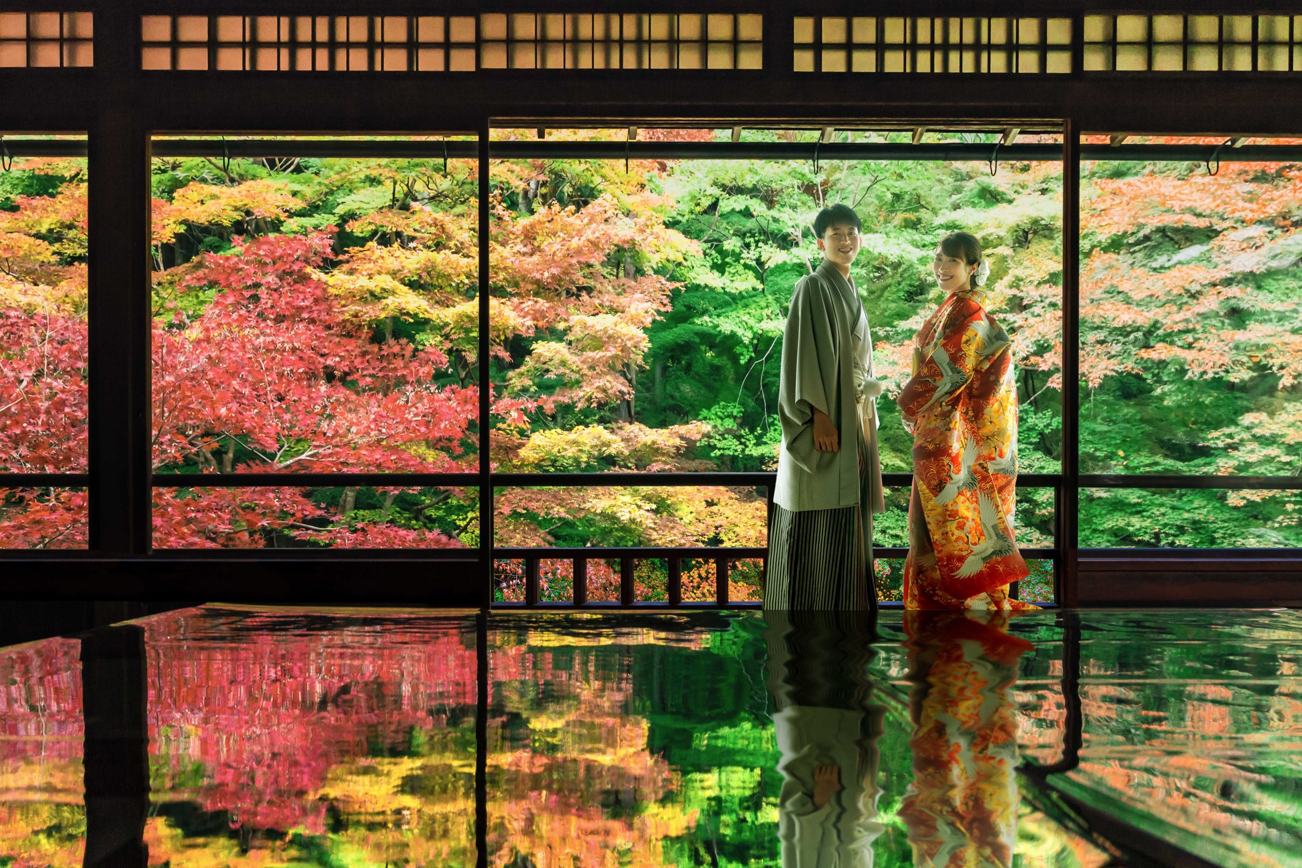 壮大な紅葉を背景におふたりの立ち姿が凛としていて素敵です♪