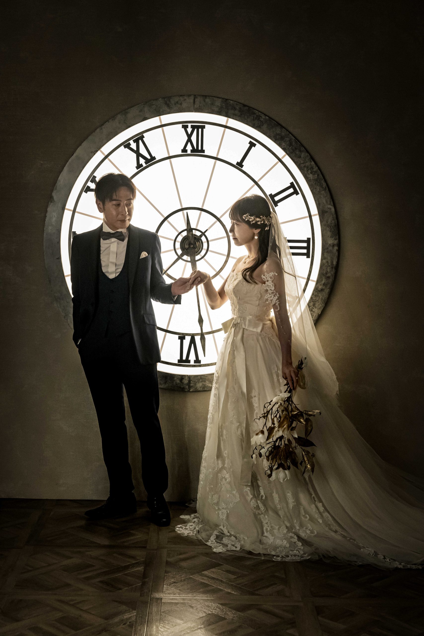 時計の前で手を取り合うおふたりの姿は、未来への第一歩を象徴するようなドラマチックな瞬間✧