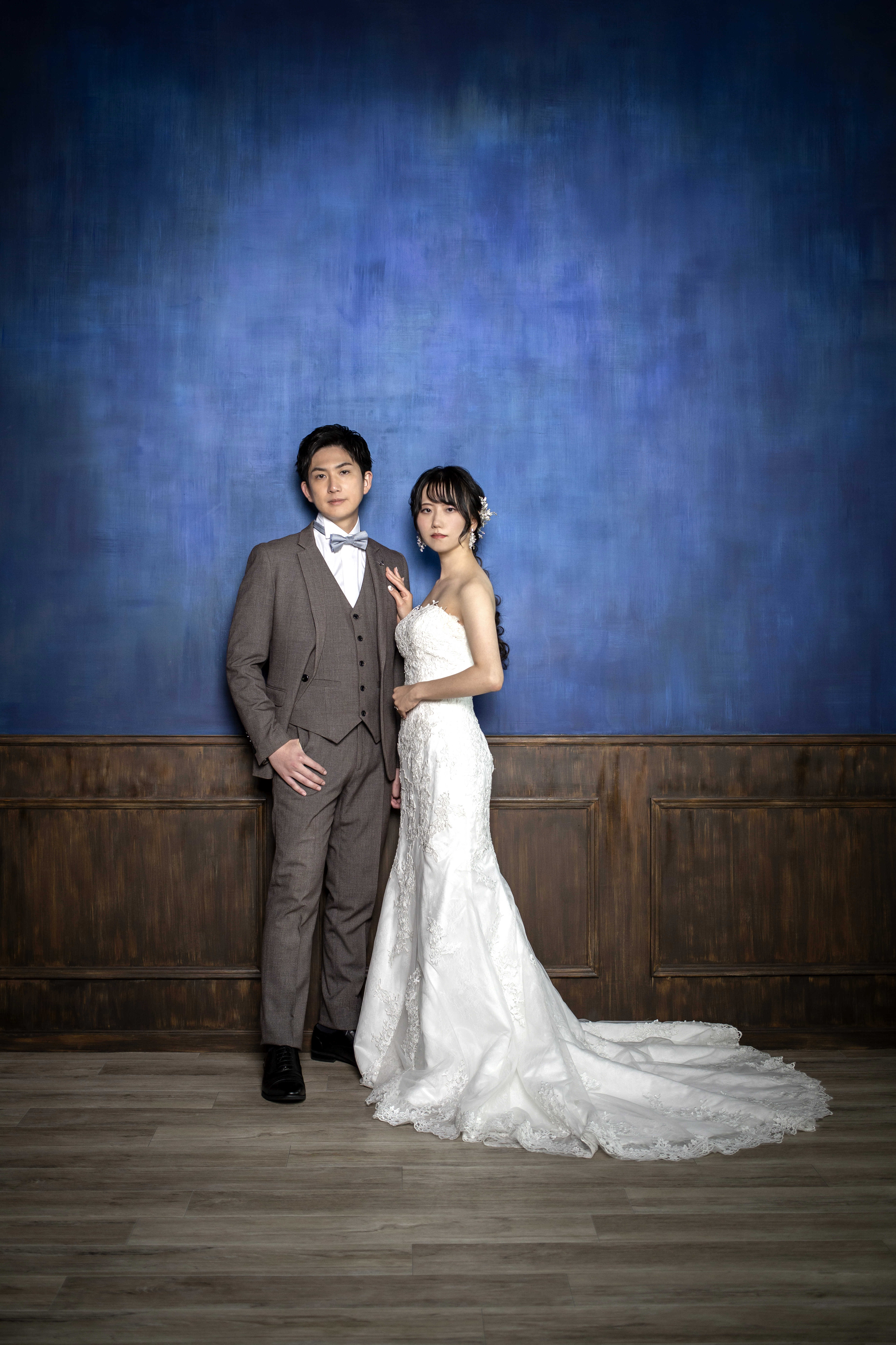 クールなブルーウォールを背景に、寄り添うおふたり。