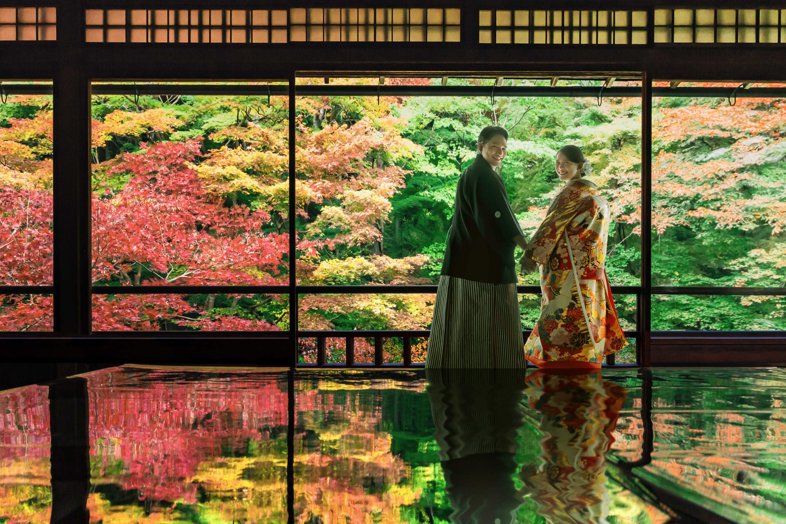 瑠璃光院の落ち着いた空間で、手を繋ぎ振り返るおふたり♪