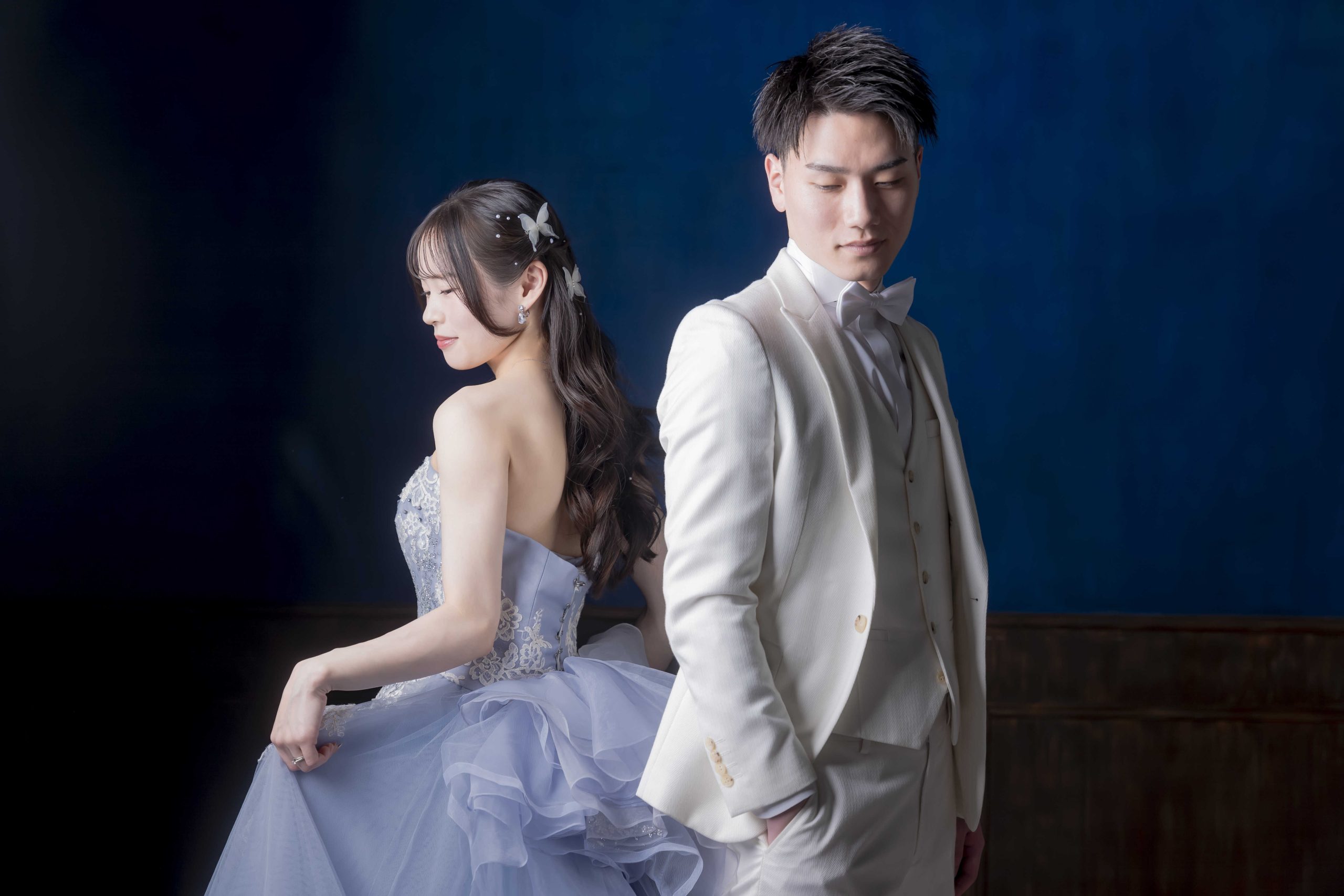 シックなブルーの背景が、大人っぽい雰囲気を引き立てます。