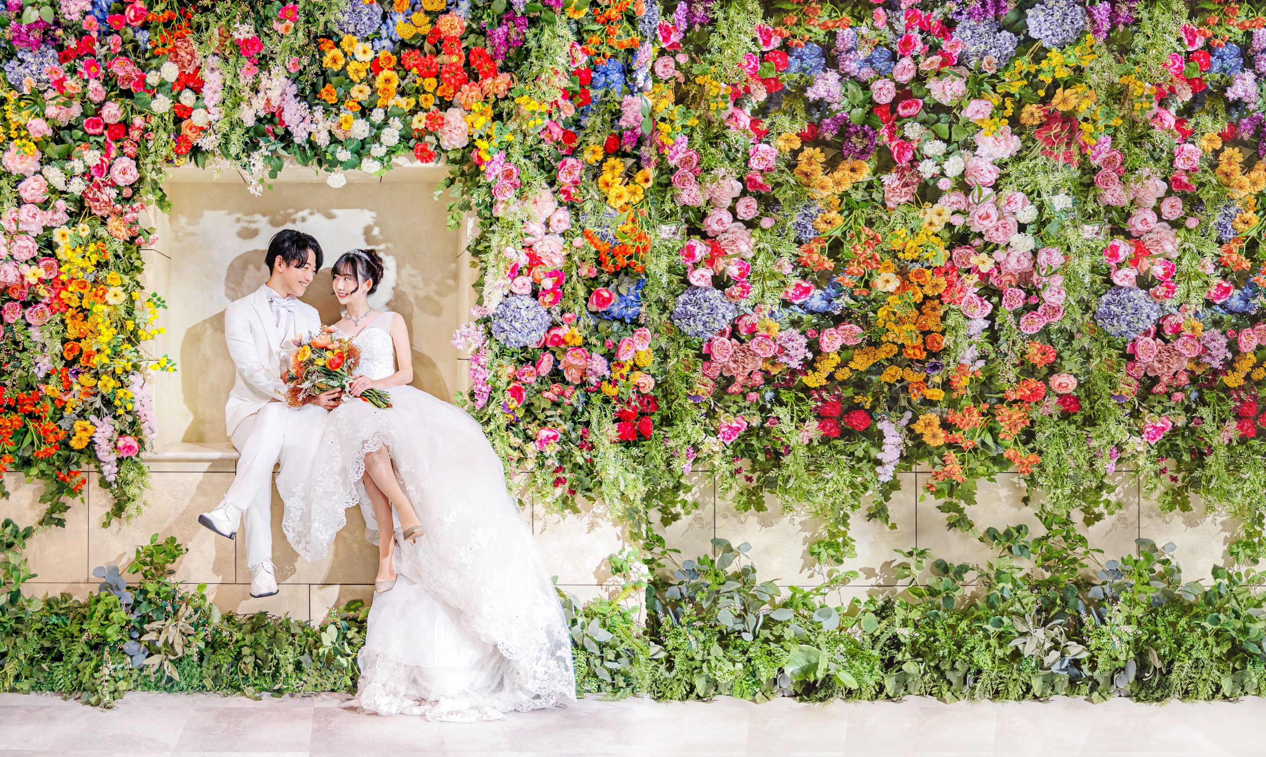 色とりどりの花々に囲まれて、肩を寄せてそっと微笑み合うおふたり。