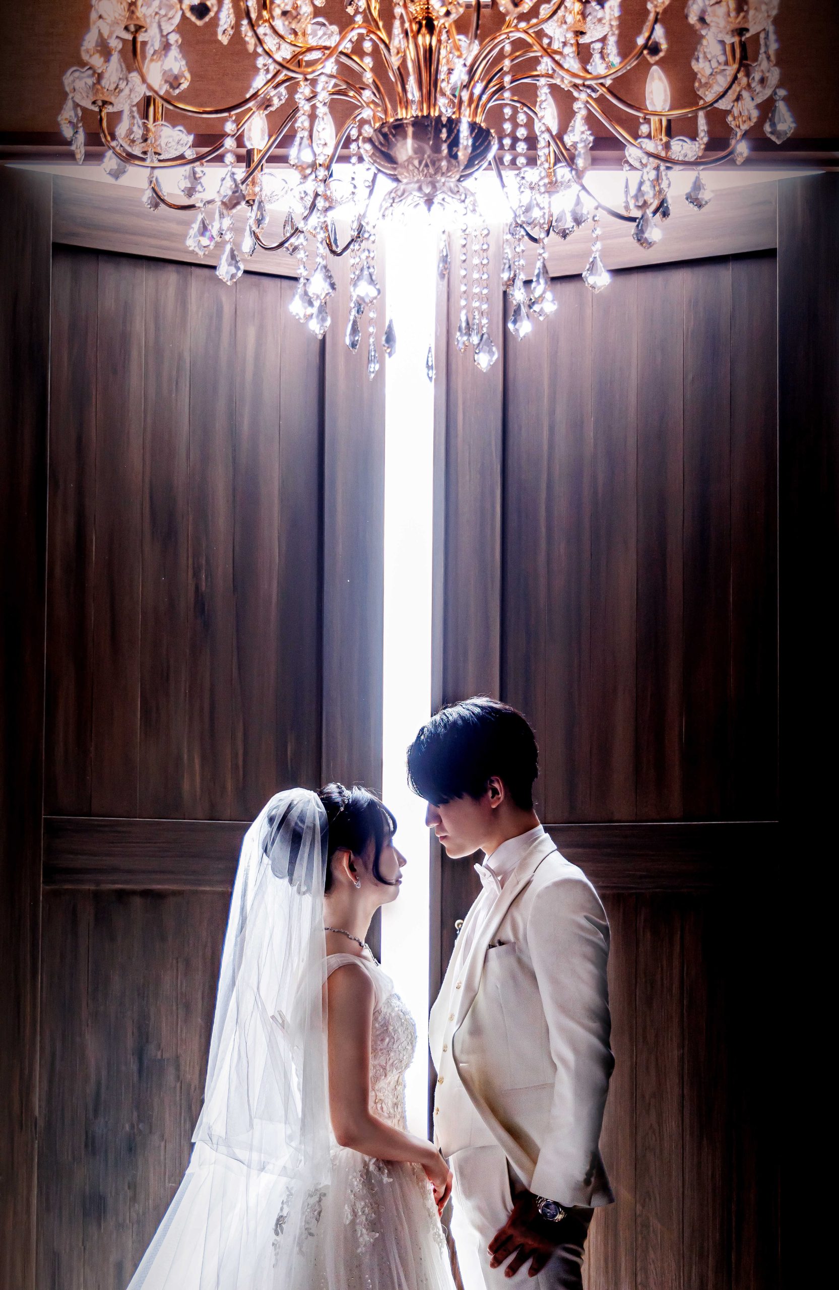 大きなドアから差し込む光の中で見つめ合うおふたり。