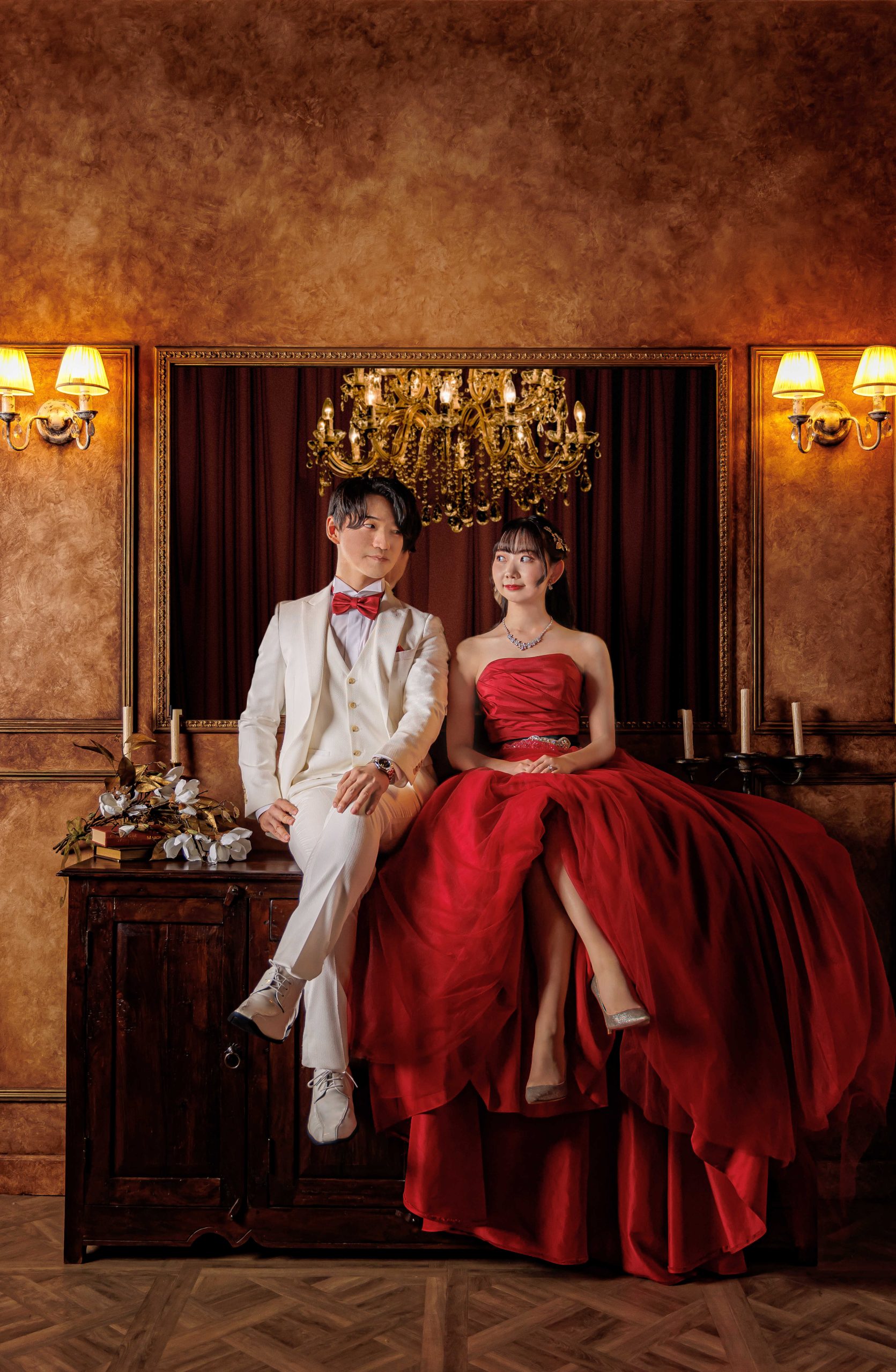 赤色のドレスが、ミラーの前でひときわ際立つ新婦様。