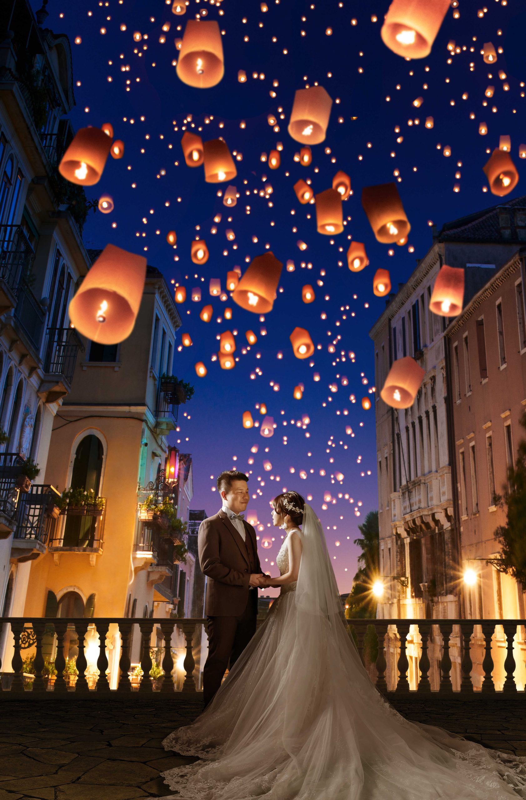 無数のランタンの中、手を繋ぎ見つめあうふたり。