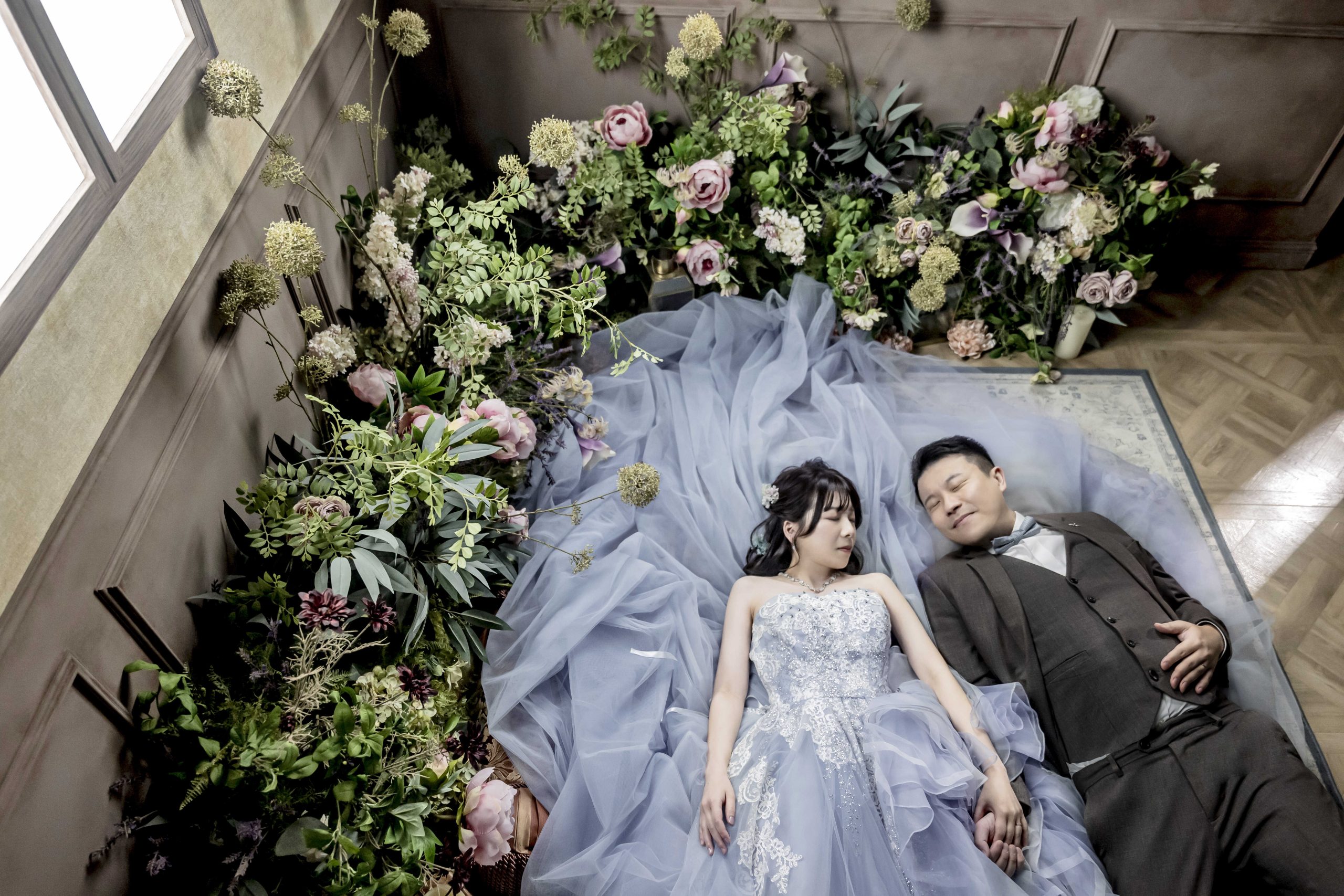 ふんわり広がったドレスの上に並んで寝転ぶおふたり。