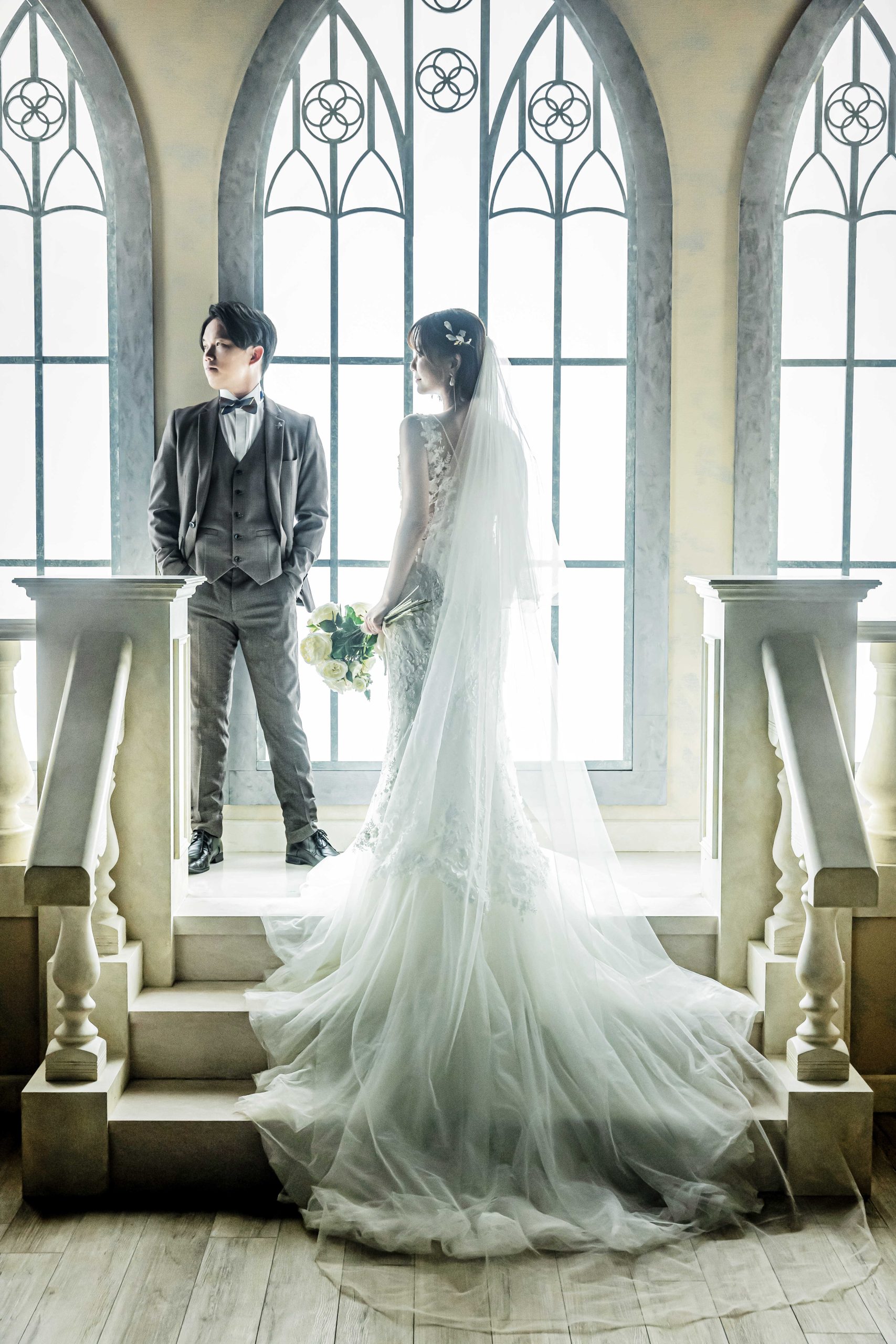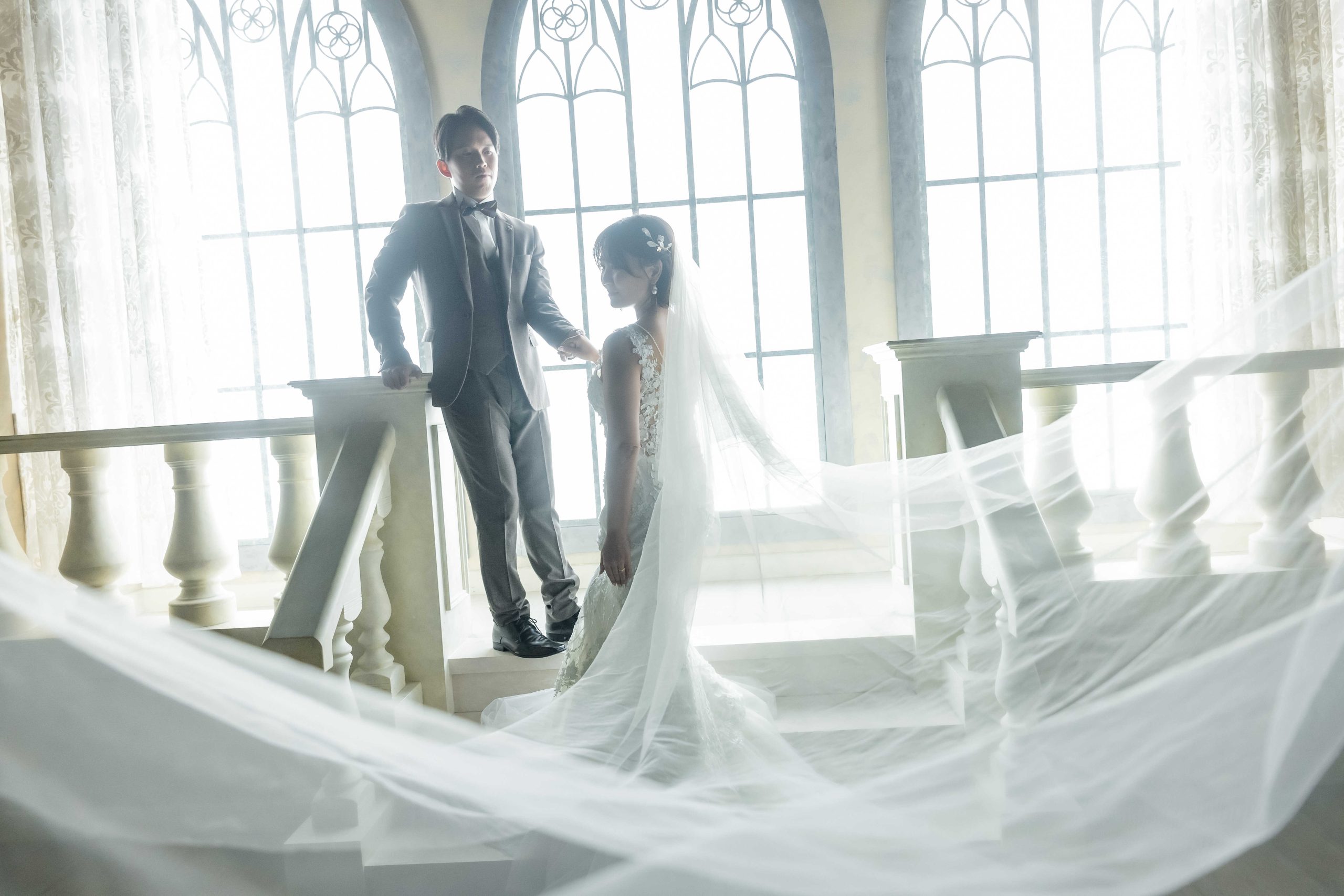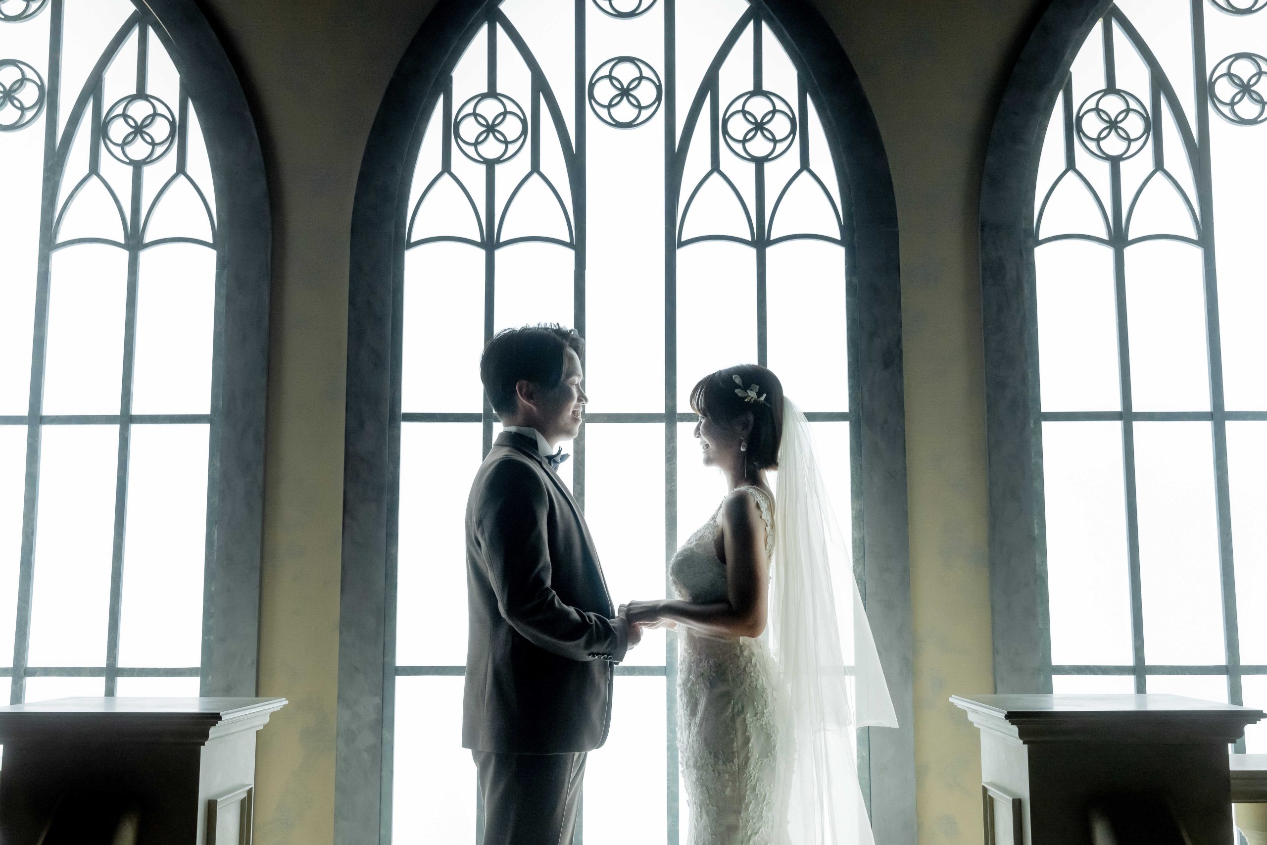 チャペルの中心で、手を取り合って見つめ合うおふたり。