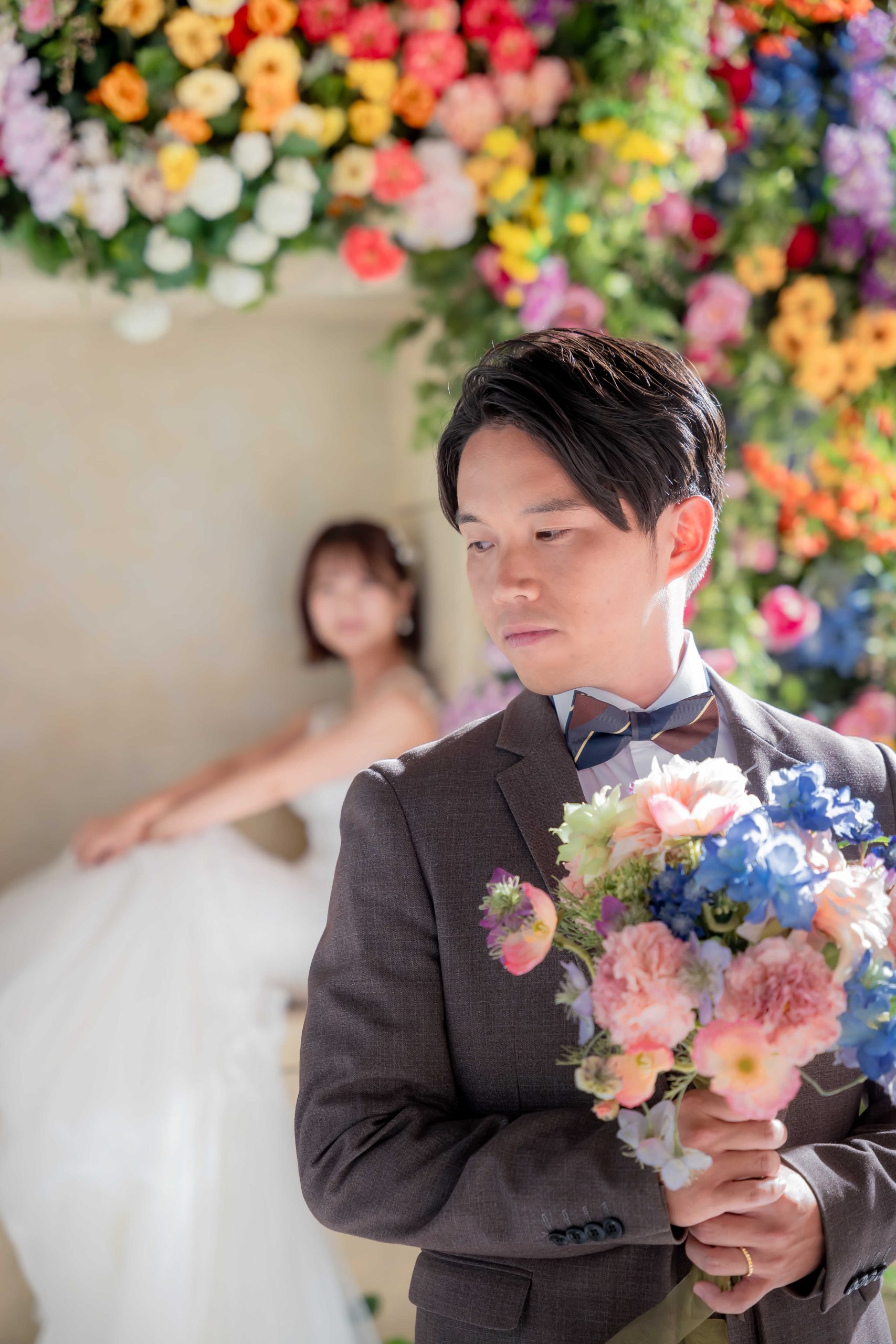 色鮮やかなブーケを新婦様へ‥緊張感伝わる新郎様の横顔。