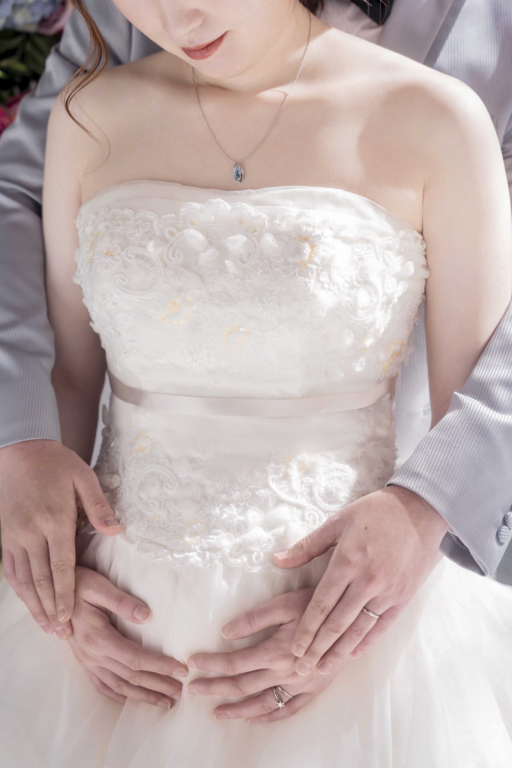 おふたりの手が、やさしくお腹に添えられて。命のぬくもりと愛おしさを感じるマタニティショットは、